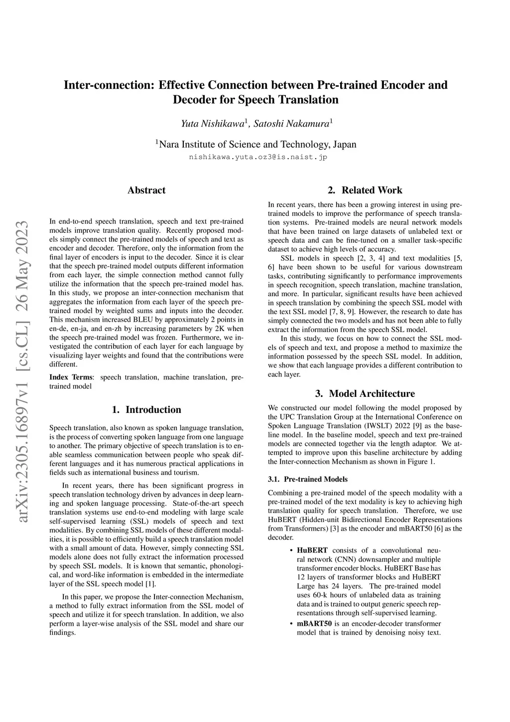 In end-to-end speech translation, speech and text pre-trained models improve translation quality. Recently proposed models simply connect the pre-trained models of speech and text as encoder and decoder. Therefore, only the information from the final layer of encoders is input to the decoder. Since it is clear that the speech pre-trained model outputs different information from each layer, the simple connection method cannot fully utilize the information that the speech pre-trained model has. In this study, we propose an inter-connection mechanism that aggregates the information from each layer of the speech pre-trained model by weighted sums and inputs into the decoder. This mechanism increased BLEU by approximately 2 points in en-de, en-ja, and en-zh by increasing parameters by 2K when the speech pre-trained model was frozen. Furthermore, we investigated the contribution of each layer for each language by visualizing layer weights and found that the contributions were different.