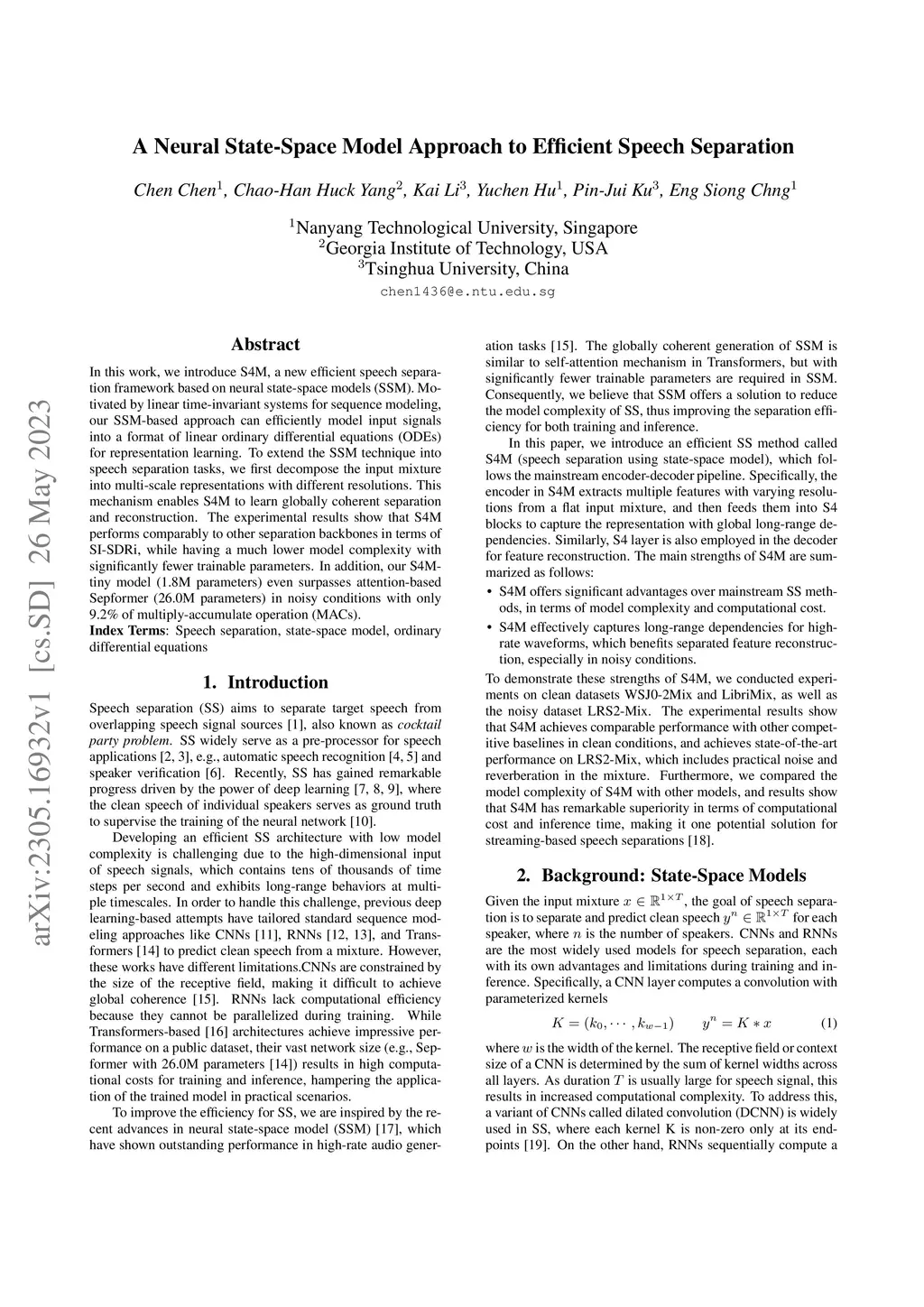 A Neural State-Space Model Approach to Efficient Speech Separation