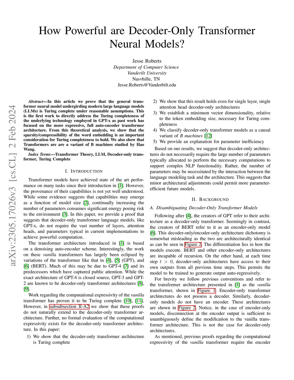 In this article we prove that the general transformer neural model undergirding modern large language models (LLMs) is Turing complete under reasonable assumptions. This is the first work to directly address the Turing completeness of the underlying technology employed in GPT-x as past work has focused on the more expressive, full auto-encoder transformer architecture. From this theoretical analysis, we show that the sparsity/compressibility of the word embedding is an important consideration for Turing completeness to hold. We also show that Transformers are are a variant of B machines studied by Hao Wang.