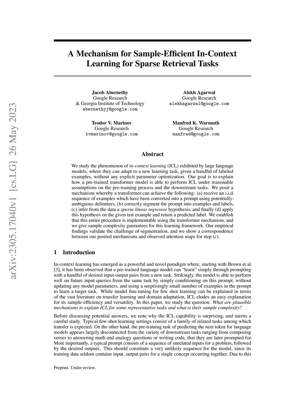 We study the phenomenon of \textit{in-context learning} (ICL) exhibited by large language models, where they can adapt to a new learning task, given a handful of labeled examples, without any explicit parameter optimization. Our goal is to explain how a pre-trained transformer model is able to perform ICL under reasonable assumptions on the pre-training process and the downstream tasks. We posit a mechanism whereby a transformer can achieve the following: (a) receive an i.i.d. sequence of examples which have been converted into a prompt using potentially-ambiguous delimiters, (b) correctly segment the prompt into examples and labels, (c) infer from the data a \textit{sparse linear regressor} hypothesis, and finally (d) apply this hypothesis on the given test example and return a predicted label. We establish that this entire procedure is implementable using the transformer mechanism, and we give sample complexity guarantees for this learning framework. Our empirical findings validate the challenge of segmentation, and we show a correspondence between our posited mechanisms and observed attention maps for step (c).