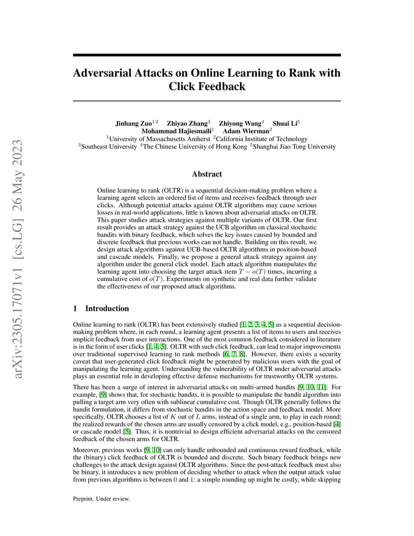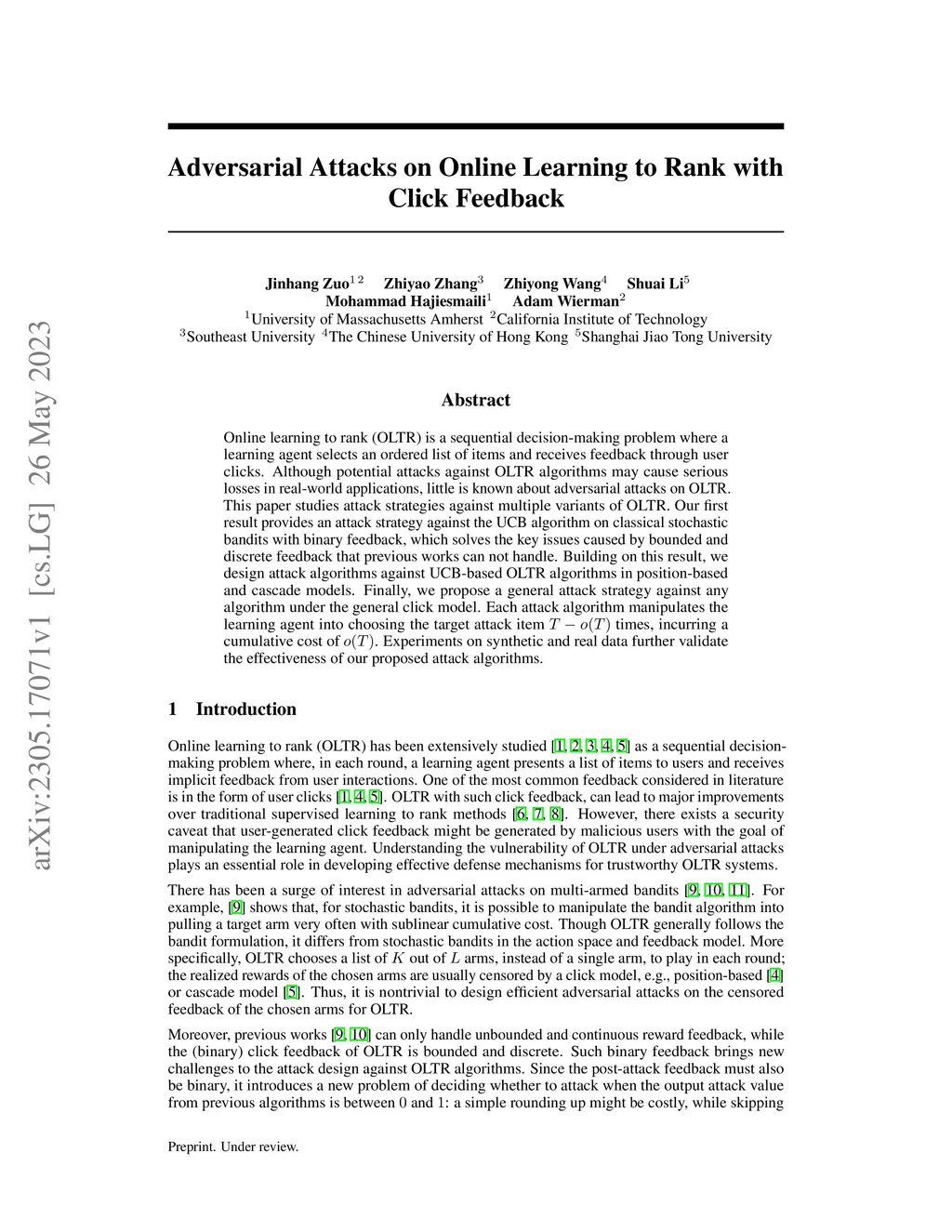 Online learning to rank (OLTR) is a sequential decision-making problem where a learning agent selects an ordered list of items and receives feedback through user clicks. Although potential attacks against OLTR algorithms may cause serious losses in real-world applications, little is known about adversarial attacks on OLTR. This paper studies attack strategies against multiple variants of OLTR. Our first result provides an attack strategy against the UCB algorithm on classical stochastic bandits with binary feedback, which solves the key issues caused by bounded and discrete feedback that previous works can not handle. Building on this result, we design attack algorithms against UCB-based OLTR algorithms in position-based and cascade models. Finally, we propose a general attack strategy against any algorithm under the general click model. Each attack algorithm manipulates the learning agent into choosing the target attack item times, incurring a cumulative cost of . Experiments on synthetic and real data further validate the effectiveness of our proposed attack algorithms.