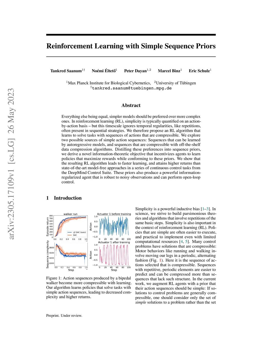 Everything else being equal, simpler models should be preferred over more complex ones. In reinforcement learning (RL), simplicity is typically quantified on an action-by-action basis -- but this timescale ignores temporal regularities, like repetitions, often present in sequential strategies. We therefore propose an RL algorithm that learns to solve tasks with sequences of actions that are compressible. We explore two possible sources of simple action sequences: Sequences that can be learned by autoregressive models, and sequences that are compressible with off-the-shelf data compression algorithms. Distilling these preferences into sequence priors, we derive a novel information-theoretic objective that incentivizes agents to learn policies that maximize rewards while conforming to these priors. We show that the resulting RL algorithm leads to faster learning, and attains higher returns than state-of-the-art model-free approaches in a series of continuous control tasks from the DeepMind Control Suite. These priors also produce a powerful information-regularized agent that is robust to noisy observations and can perform open-loop control.