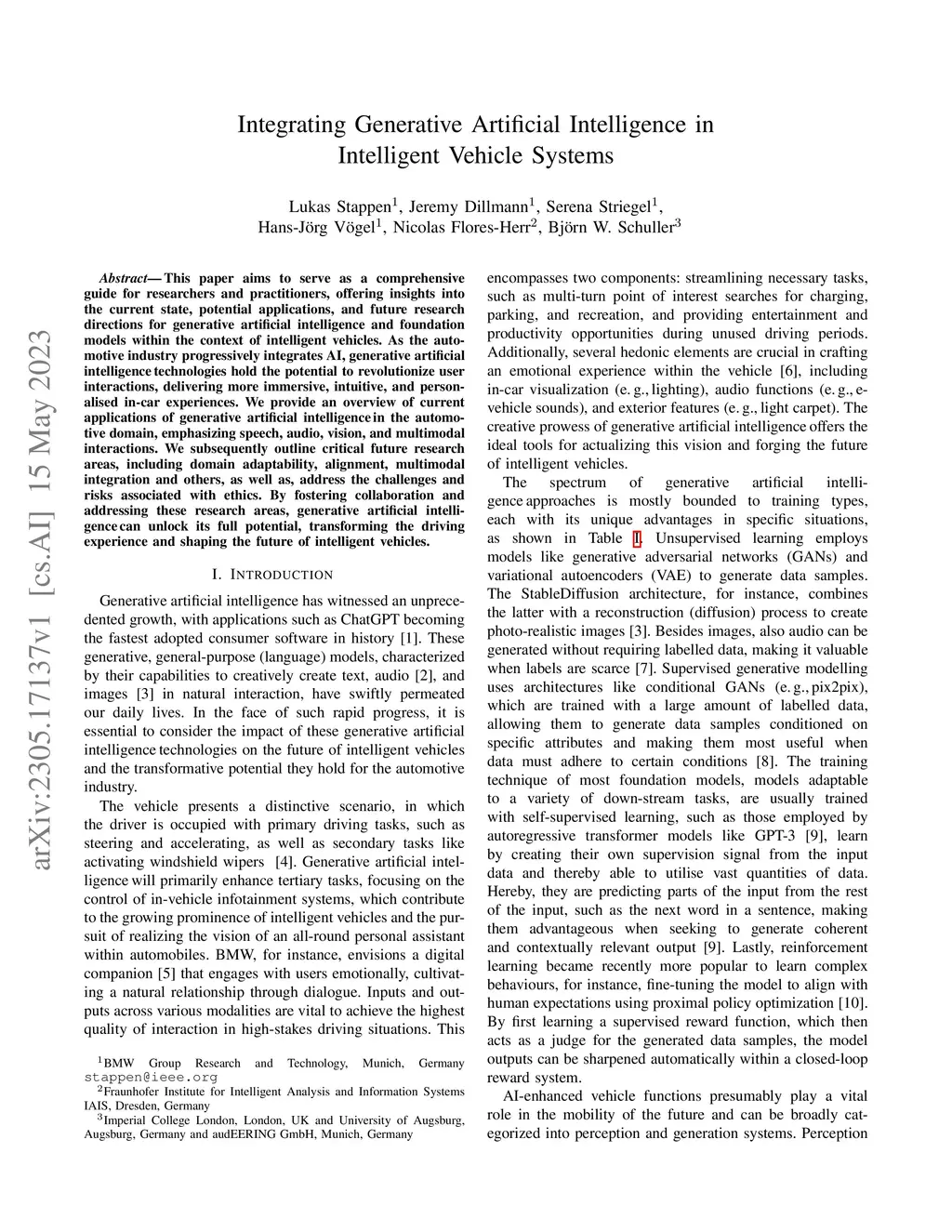 This paper aims to serve as a comprehensive guide for researchers and practitioners, offering insights into the current state, potential applications, and future research directions for generative artificial intelligence and foundation models within the context of intelligent vehicles. As the automotive industry progressively integrates AI, generative artificial intelligence technologies hold the potential to revolutionize user interactions, delivering more immersive, intuitive, and personalised in-car experiences. We provide an overview of current applications of generative artificial intelligence in the automotive domain, emphasizing speech, audio, vision, and multimodal interactions. We subsequently outline critical future research areas, including domain adaptability, alignment, multimodal integration and others, as well as, address the challenges and risks associated with ethics. By fostering collaboration and addressing these research areas, generative artificial intelligence can unlock its full potential, transforming the driving experience and shaping the future of intelligent vehicles.