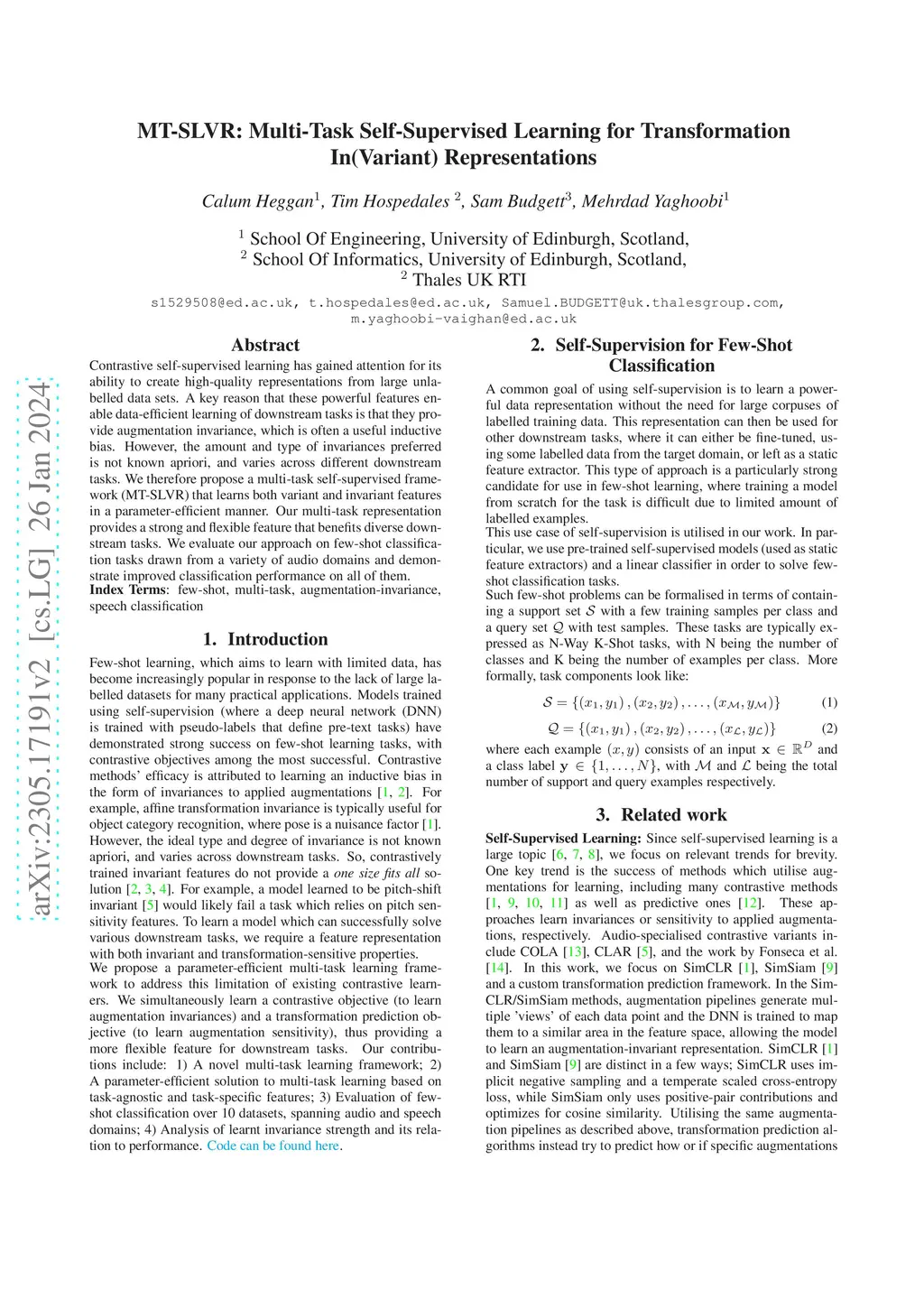 Contrastive self-supervised learning has gained attention for its ability to create high-quality representations from large unlabelled data sets. A key reason that these powerful features enable data-efficient learning of downstream tasks is that they provide augmentation invariance, which is often a useful inductive bias. However, the amount and type of invariances preferred is not known apriori, and varies across different downstream tasks. We therefore propose a multi-task self-supervised framework (MT-SLVR) that learns both variant and invariant features in a parameter-efficient manner. Our multi-task representation provides a strong and flexible feature that benefits diverse downstream tasks. We evaluate our approach on few-shot classification tasks drawn from a variety of audio domains and demonstrate improved classification performance on all of them