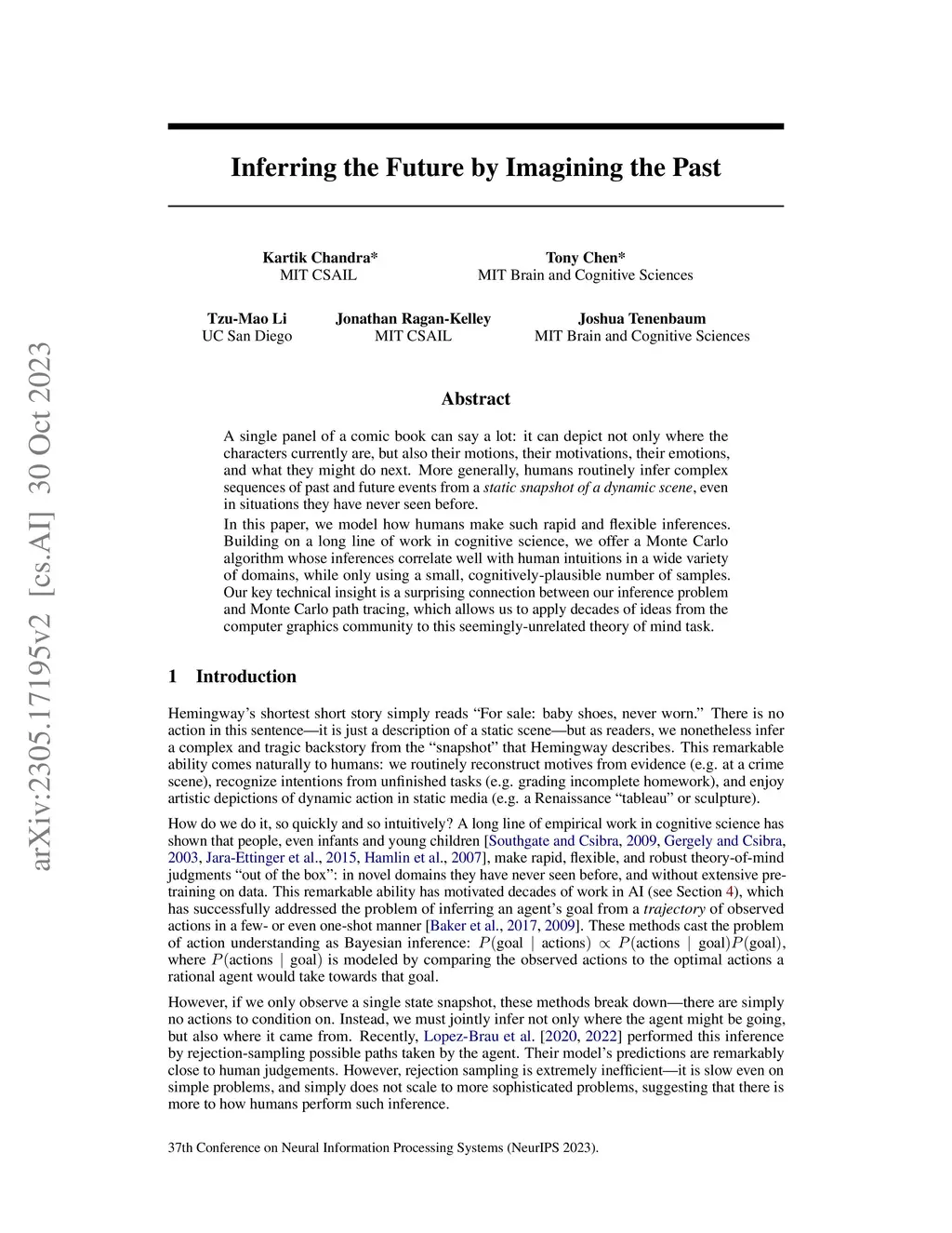 A single panel of a comic book can say a lot: it can depict not only where the characters currently are, but also their motions, their motivations, their emotions, and what they might do next. More generally, humans routinely infer complex sequences of past and future events from a *static snapshot* of a *dynamic scene*, even in situations they have never seen before. In this paper, we model how humans make such rapid and flexible inferences. Building on a long line of work in cognitive science, we offer a Monte Carlo algorithm whose inferences correlate well with human intuitions in a wide variety of domains, while only using a small, cognitively-plausible number of samples. Our key technical insight is a surprising connection between our inference problem and Monte Carlo path tracing, which allows us to apply decades of ideas from the computer graphics community to this seemingly-unrelated theory of mind task.