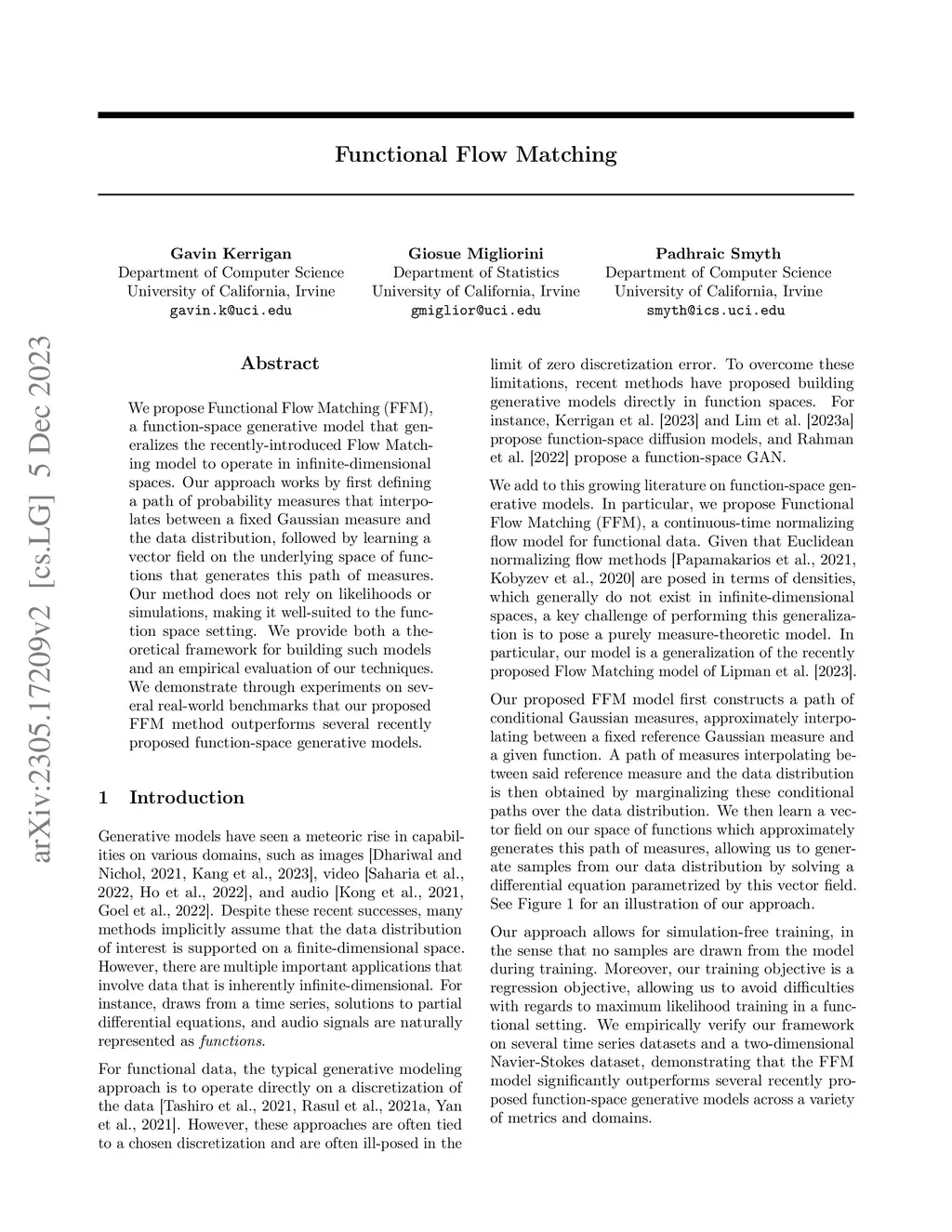 We propose Functional Flow Matching (FFM), a function-space generative model that generalizes the recently-introduced Flow Matching model to operate in infinite-dimensional spaces. Our approach works by first defining a path of probability measures that interpolates between a fixed Gaussian measure and the data distribution, followed by learning a vector field on the underlying space of functions that generates this path of measures. Our method does not rely on likelihoods or simulations, making it well-suited to the function space setting. We provide both a theoretical framework for building such models and an empirical evaluation of our techniques. We demonstrate through experiments on several real-world benchmarks that our proposed FFM method outperforms several recently proposed function-space generative models.