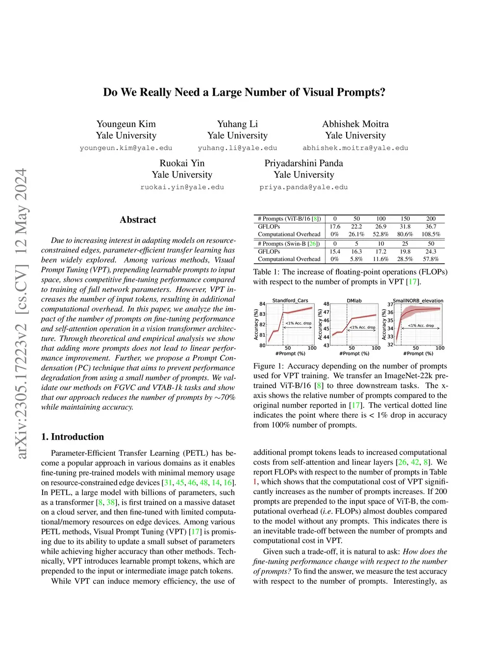 Due to increasing interest in adapting models on resource-constrained edges, parameter-efficient transfer learning has been widely explored. Among various methods, Visual Prompt Tuning (VPT), prepending learnable prompts to input space, shows competitive fine-tuning performance compared to training of full network parameters. However, VPT increases the number of input tokens, resulting in additional computational overhead. In this paper, we analyze the impact of the number of prompts on fine-tuning performance and self-attention operation in a vision transformer architecture. Through theoretical and empirical analysis we show that adding more prompts does not lead to linear performance improvement. Further, we propose a Prompt Condensation (PC) technique that aims to prevent performance degradation from using a small number of prompts. We validate our methods on FGVC and VTAB-1k tasks and show that our approach reduces the number of prompts by ~70% while maintaining accuracy.