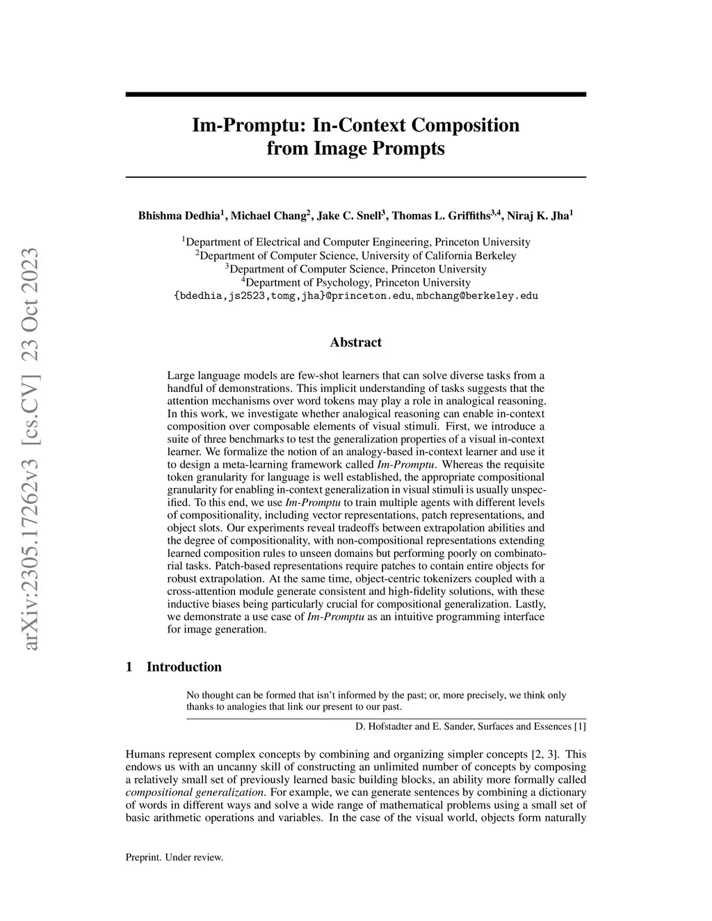 Large language models are few-shot learners that can solve diverse tasks from a handful of demonstrations. This implicit understanding of tasks suggests that the attention mechanisms over word tokens may play a role in analogical reasoning. In this work, we investigate whether analogical reasoning can enable in-context composition over composable elements of visual stimuli. First, we introduce a suite of three benchmarks to test the generalization properties of a visual in-context learner. We formalize the notion of an analogy-based in-context learner and use it to design a meta-learning framework called Im-Promptu. Whereas the requisite token granularity for language is well established, the appropriate compositional granularity for enabling in-context generalization in visual stimuli is usually unspecified. To this end, we use Im-Promptu to train multiple agents with different levels of compositionality, including vector representations, patch representations, and object slots. Our experiments reveal tradeoffs between extrapolation abilities and the degree of compositionality, with non-compositional representations extending learned composition rules to unseen domains but performing poorly on combinatorial tasks. Patch-based representations require patches to contain entire objects for robust extrapolation. At the same time, object-centric tokenizers coupled with a cross-attention module generate consistent and high-fidelity solutions, with these inductive biases being particularly crucial for compositional generalization. Lastly, we demonstrate a use case of Im-Promptu as an intuitive programming interface for image generation.