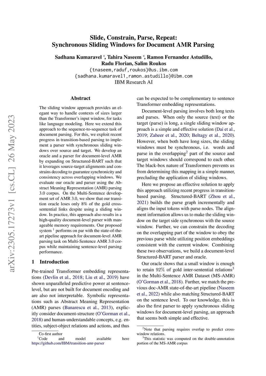 The sliding window approach provides an elegant way to handle contexts of sizes larger than the Transformer's input window, for tasks like language modeling. Here we extend this approach to the sequence-to-sequence task of document parsing. For this, we exploit recent progress in transition-based parsing to implement a parser with synchronous sliding windows over source and target. We develop an oracle and a parser for document-level AMR by expanding on Structured-BART such that it leverages source-target alignments and constrains decoding to guarantee synchronicity and consistency across overlapping windows. We evaluate our oracle and parser using the Abstract Meaning Representation (AMR) parsing 3.0 corpus. On the Multi-Sentence development set of AMR 3.0, we show that our transition oracle loses only 8\% of the gold cross-sentential links despite using a sliding window. In practice, this approach also results in a high-quality document-level parser with manageable memory requirements. Our proposed system performs on par with the state-of-the-art pipeline approach for document-level AMR parsing task on Multi-Sentence AMR 3.0 corpus while maintaining sentence-level parsing performance.
