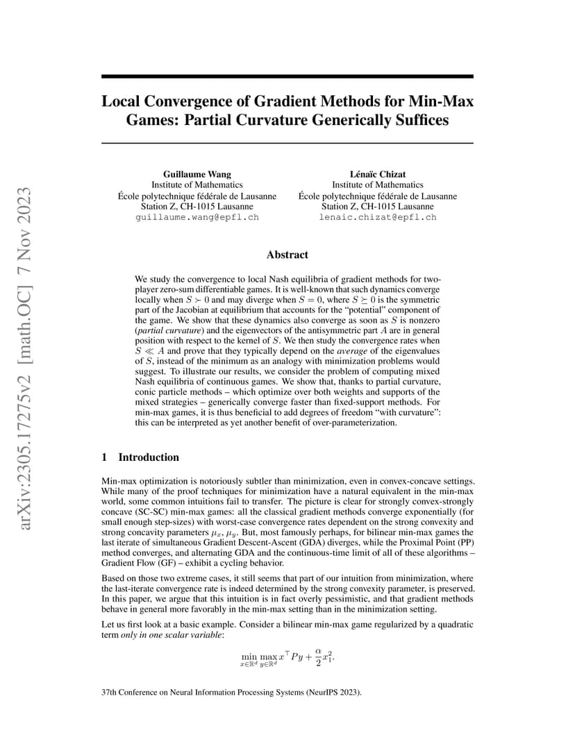 We study the convergence to local Nash equilibria of gradient methods for two-player zero-sum differentiable games. It is well-known that such dynamics converge locally when and may diverge when , where is the symmetric part of the Jacobian at equilibrium that accounts for the "potential" component of the game. We show that these dynamics also converge as soon as is nonzero (partial curvature) and the eigenvectors of the antisymmetric part are in general position with respect to the kernel of . We then study the convergence rates when and prove that they typically depend on the average of the eigenvalues of , instead of the minimum as an analogy with minimization problems would suggest. To illustrate our results, we consider the problem of computing mixed Nash equilibria of continuous games. We show that, thanks to partial curvature, conic particle methods -- which optimize over both weights and supports of the mixed strategies -- generically converge faster than fixed-support methods. For min-max games, it is thus beneficial to add degrees of freedom "with curvature": this can be interpreted as yet another benefit of over-parameterization.