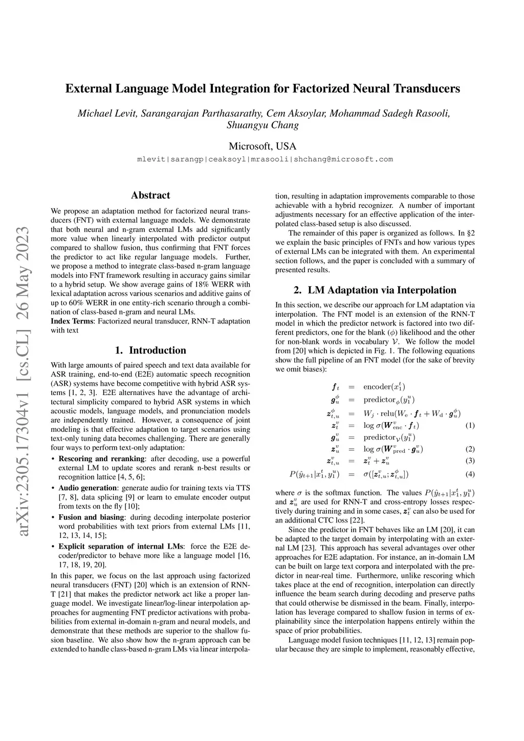 We propose an adaptation method for factorized neural transducers (FNT) with external language models. We demonstrate that both neural and n-gram external LMs add significantly more value when linearly interpolated with predictor output compared to shallow fusion, thus confirming that FNT forces the predictor to act like regular language models. Further, we propose a method to integrate class-based n-gram language models into FNT framework resulting in accuracy gains similar to a hybrid setup. We show average gains of 18% WERR with lexical adaptation across various scenarios and additive gains of up to 60% WERR in one entity-rich scenario through a combination of class-based n-gram and neural LMs.