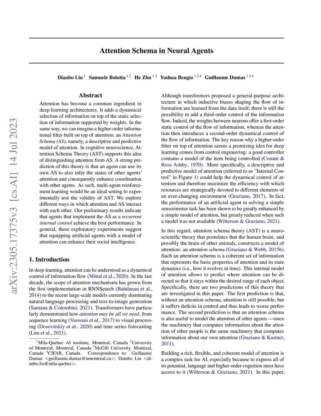 Attention has become a common ingredient in deep learning architectures. It adds a dynamical selection of information on top of the static selection of information supported by weights. In the same way, we can imagine a higher-order informational filter built on top of attention: an Attention Schema (AS), namely, a descriptive and predictive model of attention. In cognitive neuroscience, Attention Schema Theory (AST) supports this idea of distinguishing attention from AS. A strong prediction of this theory is that an agent can use its own AS to also infer the states of other agents' attention and consequently enhance coordination with other agents. As such, multi-agent reinforcement learning would be an ideal setting to experimentally test the validity of AST. We explore different ways in which attention and AS interact with each other. Our preliminary results indicate that agents that implement the AS as a recurrent internal control achieve the best performance. In general, these exploratory experiments suggest that equipping artificial agents with a model of attention can enhance their social intelligence.