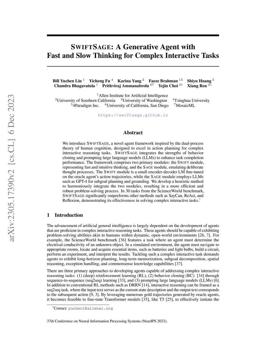 SwiftSage: A Generative Agent with Fast and Slow Thinking for Complex