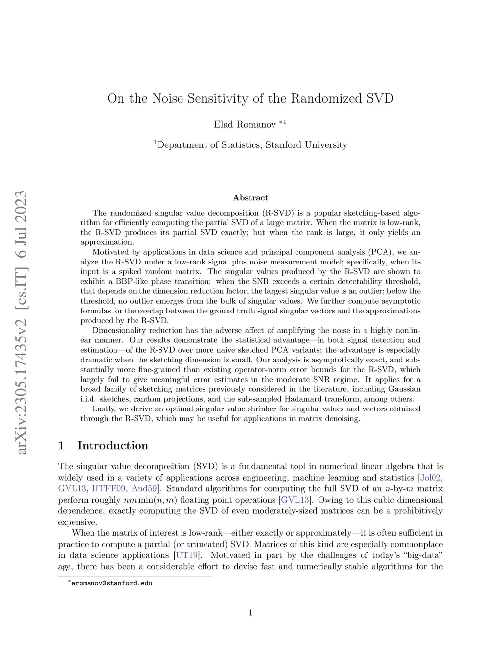 The randomized singular value decomposition (R-SVD) is a popular sketching-based algorithm for efficiently computing the partial SVD of a large matrix. When the matrix is low-rank, the R-SVD produces its partial SVD exactly; but when the rank is large, it only yields an approximation. Motivated by applications in data science and principal component analysis (PCA), we analyze the R-SVD under a low-rank signal plus noise measurement model; specifically, when its input is a spiked random matrix. The singular values produced by the R-SVD are shown to exhibit a BBP-like phase transition: when the SNR exceeds a certain detectability threshold, that depends on the dimension reduction factor, the largest singular value is an outlier; below the threshold, no outlier emerges from the bulk of singular values. We further compute asymptotic formulas for the overlap between the ground truth signal singular vectors and the approximations produced by the R-SVD. Dimensionality reduction has the adverse affect of amplifying the noise in a highly nonlinear manner. Our results demonstrate the statistical advantage -- in both signal detection and estimation -- of the R-SVD over more naive sketched PCA variants; the advantage is especially dramatic when the sketching dimension is small. Our analysis is asymptotically exact, and substantially more fine-grained than existing operator-norm error bounds for the R-SVD, which largely fail to give meaningful error estimates in the moderate SNR regime. It applies for a broad family of sketching matrices previously considered in the literature, including Gaussian i.i.d. sketches, random projections, and the sub-sampled Hadamard transform, among others. Lastly, we derive an optimal singular value shrinker for singular values and vectors obtained through the R-SVD, which may be useful for applications in matrix denoising.