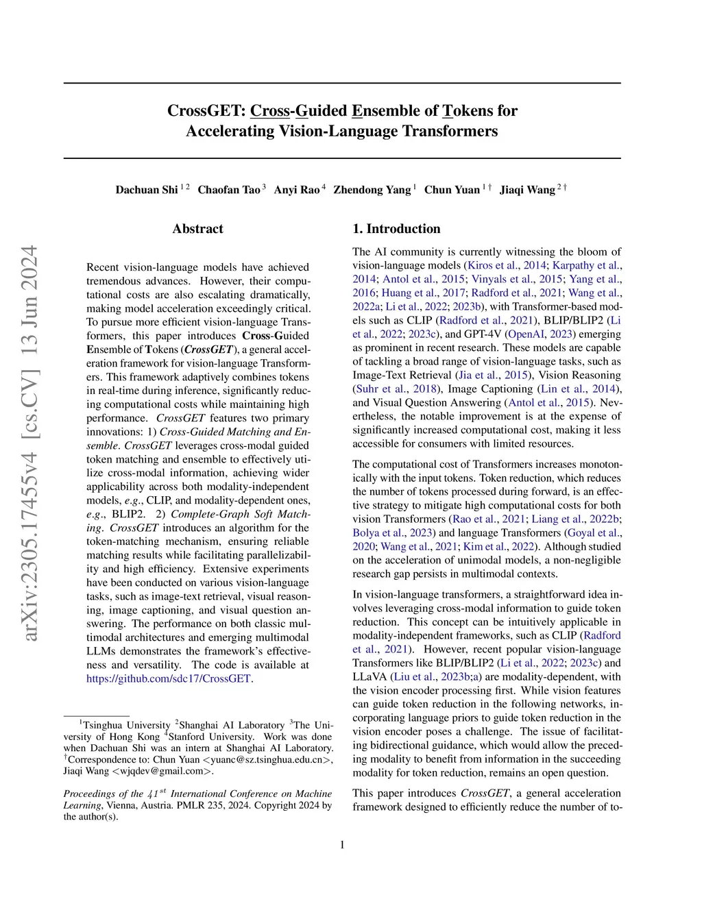 Recent vision-language models have achieved tremendous advances. However, their computational costs are also escalating dramatically, making model acceleration exceedingly critical. To pursue more efficient vision-language Transformers, this paper introduces Cross-Guided Ensemble of Tokens (CrossGET), a general acceleration framework for vision-language Transformers. This framework adaptively combines tokens in real-time during inference, significantly reducing computational costs while maintaining high performance. CrossGET features two primary innovations: 1) Cross-Guided Matching and Ensemble. CrossGET leverages cross-modal guided token matching and ensemble to effectively utilize cross-modal information, achieving wider applicability across both modality-independent models, e.g., CLIP, and modality-dependent ones, e.g., BLIP2. 2) Complete-Graph Soft Matching. CrossGET introduces an algorithm for the token-matching mechanism, ensuring reliable matching results while facilitating parallelizability and high efficiency. Extensive experiments have been conducted on various vision-language tasks, such as image-text retrieval, visual reasoning, image captioning, and visual question answering. The performance on both classic multimodal architectures and emerging multimodal LLMs demonstrates the framework's effectiveness and versatility. The code is available at https://github.com/sdc17/CrossGET.