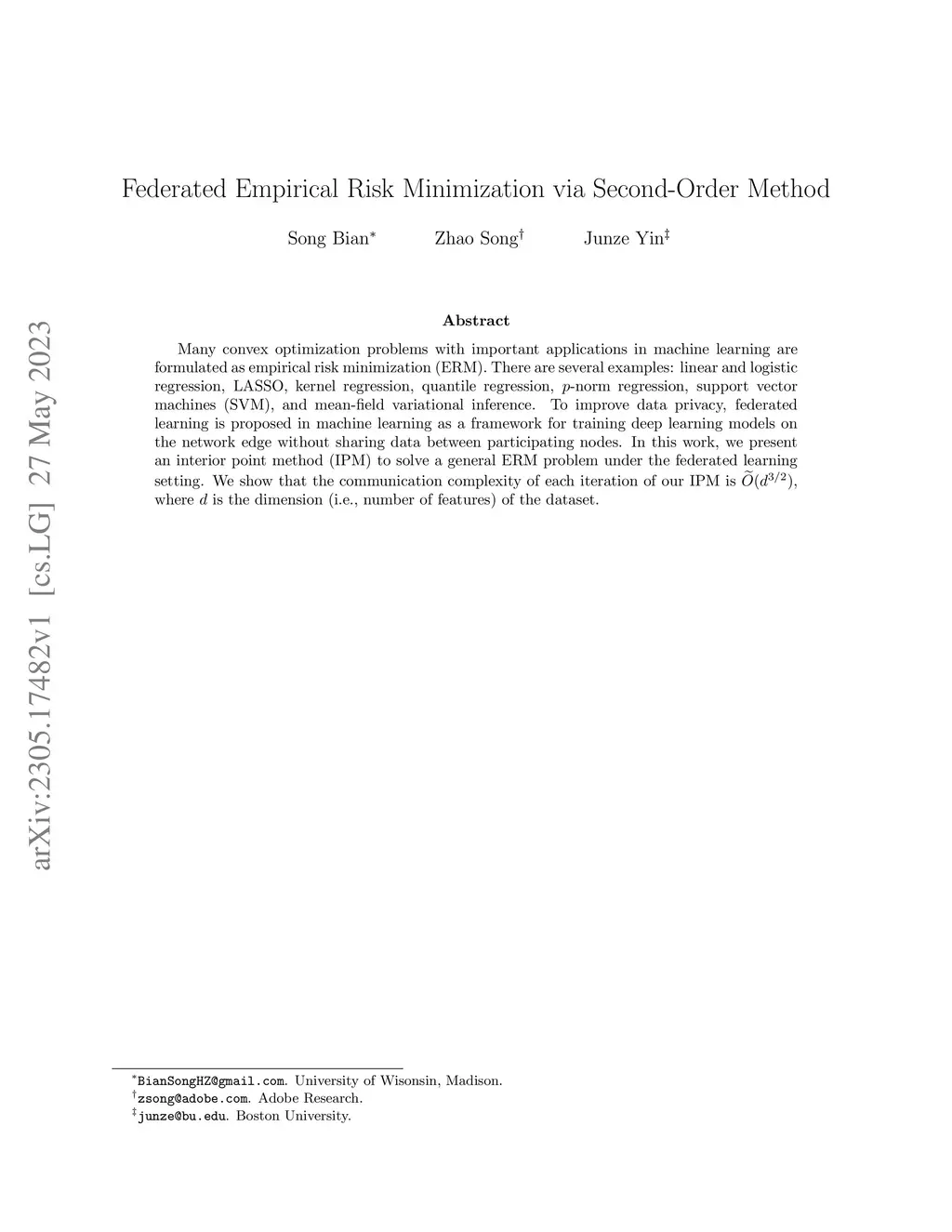 Many convex optimization problems with important applications in machine learning are formulated as empirical risk minimization (ERM). There are several examples: linear and logistic regression, LASSO, kernel regression, quantile regression, -norm regression, support vector machines (SVM), and mean-field variational inference. To improve data privacy, federated learning is proposed in machine learning as a framework for training deep learning models on the network edge without sharing data between participating nodes. In this work, we present an interior point method (IPM) to solve a general ERM problem under the federated learning setting. We show that the communication complexity of each iteration of our IPM is , where is the dimension (i.e., number of features) of the dataset.