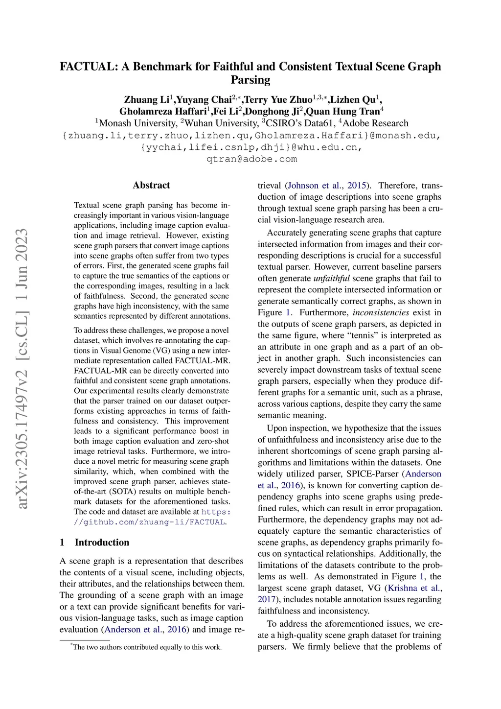 Textual scene graph parsing has become increasingly important in various vision-language applications, including image caption evaluation and image retrieval. However, existing scene graph parsers that convert image captions into scene graphs often suffer from two types of errors. First, the generated scene graphs fail to capture the true semantics of the captions or the corresponding images, resulting in a lack of faithfulness. Second, the generated scene graphs have high inconsistency, with the same semantics represented by different annotations. To address these challenges, we propose a novel dataset, which involves re-annotating the captions in Visual Genome (VG) using a new intermediate representation called FACTUAL-MR. FACTUAL-MR can be directly converted into faithful and consistent scene graph annotations. Our experimental results clearly demonstrate that the parser trained on our dataset outperforms existing approaches in terms of faithfulness and consistency. This improvement leads to a significant performance boost in both image caption evaluation and zero-shot image retrieval tasks. Furthermore, we introduce a novel metric for measuring scene graph similarity, which, when combined with the improved scene graph parser, achieves state-of-the-art (SOTA) results on multiple benchmark datasets for the aforementioned tasks. The code and dataset are available at https://github.com/zhuang-li/FACTUAL .