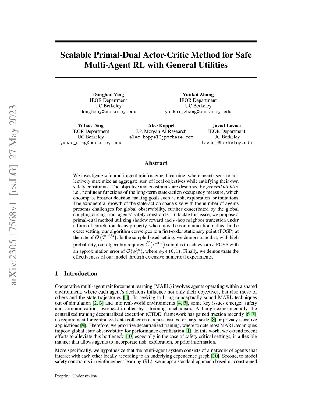 We investigate safe multi-agent reinforcement learning, where agents seek to collectively maximize an aggregate sum of local objectives while satisfying their own safety constraints. The objective and constraints are described by {\it general utilities}, i.e., nonlinear functions of the long-term state-action occupancy measure, which encompass broader decision-making goals such as risk, exploration, or imitations. The exponential growth of the state-action space size with the number of agents presents challenges for global observability, further exacerbated by the global coupling arising from agents' safety constraints. To tackle this issue, we propose a primal-dual method utilizing shadow reward and -hop neighbor truncation under a form of correlation decay property, where is the communication radius. In the exact setting, our algorithm converges to a first-order stationary point (FOSP) at the rate of . In the sample-based setting, we demonstrate that, with high probability, our algorithm requires samples to achieve an -FOSP with an approximation error of , where . Finally, we demonstrate the effectiveness of our model through extensive numerical experiments.