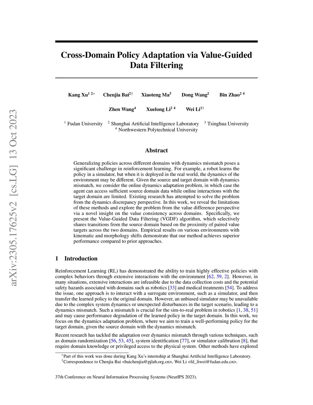 Cross-Domain Policy Adaptation via Value-Guided Data Filtering