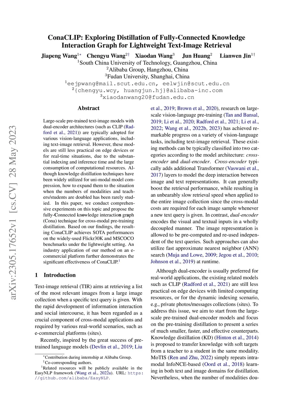 Large-scale pre-trained text-image models with dual-encoder architectures (such as CLIP) are typically adopted for various vision-language applications, including text-image retrieval. However,these models are still less practical on edge devices or for real-time situations, due to the substantial indexing and inference time and the large consumption of computational resources. Although knowledge distillation techniques have been widely utilized for uni-modal model compression, how to expand them to the situation when the numbers of modalities and teachers/students are doubled has been rarely studied. In this paper, we conduct comprehensive experiments on this topic and propose the fully-Connected knowledge interaction graph (Cona) technique for cross-modal pre-training distillation. Based on our findings, the resulting ConaCLIP achieves SOTA performances on the widely-used Flickr30K and MSCOCO benchmarks under the lightweight setting. An industry application of our method on an e-commercial platform further demonstrates the significant effectiveness of ConaCLIP.