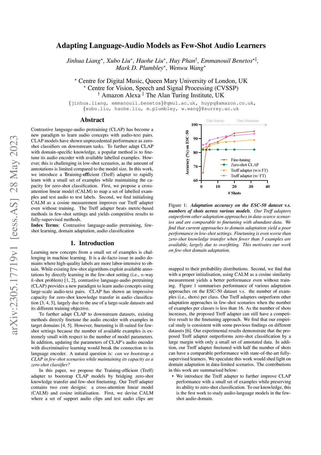 We presented the Treff adapter, a training-efficient adapter for CLAP, to boost zero-shot classification performance by making use of a small set of labelled data. Specifically, we designed CALM to retrieve the probability distribution of text-audio clips over classes using a set of audio-label pairs and combined it with CLAP's zero-shot classification results. Furthermore, we designed a training-free version of the Treff adapter by using CALM as a cosine similarity measure. Experiments showed that the proposed Treff adapter is comparable and even better than fully-supervised methods and adaptation methods in low-shot and data-abundant scenarios. While the Treff adapter shows that combining large-scale pretraining and rapid learning of domain-specific knowledge is non-trivial for obtaining generic representations for few-shot learning, it is still limited to audio classification tasks. In the future, we will explore how to use audio-language models in diverse audio domains.