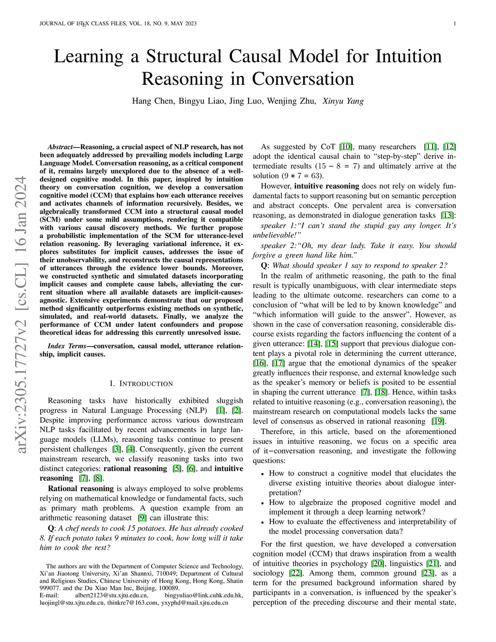 Reasoning, a crucial aspect of NLP research, has not been adequately addressed by prevailing models including Large Language Model. Conversation reasoning, as a critical component of it, remains largely unexplored due to the absence of a well-designed cognitive model. In this paper, inspired by intuition theory on conversation cognition, we develop a conversation cognitive model (CCM) that explains how each utterance receives and activates channels of information recursively. Besides, we algebraically transformed CCM into a structural causal model (SCM) under some mild assumptions, rendering it compatible with various causal discovery methods. We further propose a probabilistic implementation of the SCM for utterance-level relation reasoning. By leveraging variational inference, it explores substitutes for implicit causes, addresses the issue of their unobservability, and reconstructs the causal representations of utterances through the evidence lower bounds. Moreover, we constructed synthetic and simulated datasets incorporating implicit causes and complete cause labels, alleviating the current situation where all available datasets are implicit-causes-agnostic. Extensive experiments demonstrate that our proposed method significantly outperforms existing methods on synthetic, simulated, and real-world datasets. Finally, we analyze the performance of CCM under latent confounders and propose theoretical ideas for addressing this currently unresolved issue.