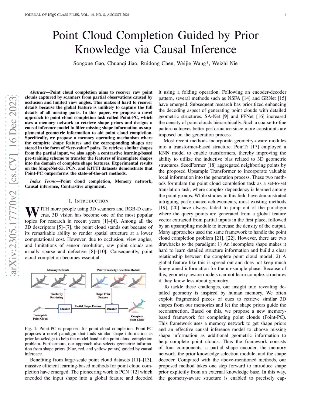 Point cloud completion aims to recover raw point clouds captured by scanners from partial observations caused by occlusion and limited view angles. This makes it hard to recover details because the global feature is unlikely to capture the full details of all missing parts. In this paper, we propose a novel approach to point cloud completion task called Point-PC, which uses a memory network to retrieve shape priors and designs a causal inference model to filter missing shape information as supplemental geometric information to aid point cloud completion. Specifically, we propose a memory operating mechanism where the complete shape features and the corresponding shapes are stored in the form of ``key-value'' pairs. To retrieve similar shapes from the partial input, we also apply a contrastive learning-based pre-training scheme to transfer the features of incomplete shapes into the domain of complete shape features. Experimental results on the ShapeNet-55, PCN, and KITTI datasets demonstrate that Point-PC outperforms the state-of-the-art methods.