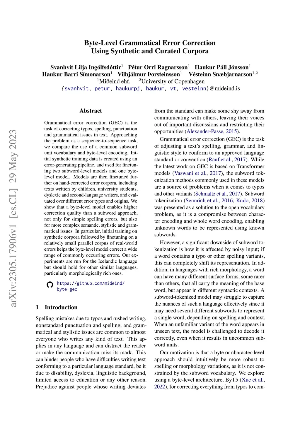 Grammatical error correction (GEC) is the task of correcting typos, spelling, punctuation and grammatical issues in text. Approaching the problem as a sequence-to-sequence task, we compare the use of a common subword unit vocabulary and byte-level encoding. Initial synthetic training data is created using an error-generating pipeline, and used for finetuning two subword-level models and one byte-level model. Models are then finetuned further on hand-corrected error corpora, including texts written by children, university students, dyslexic and second-language writers, and evaluated over different error types and origins. We show that a byte-level model enables higher correction quality than a subword approach, not only for simple spelling errors, but also for more complex semantic, stylistic and grammatical issues. In particular, initial training on synthetic corpora followed by finetuning on a relatively small parallel corpus of real-world errors helps the byte-level model correct a wide range of commonly occurring errors. Our experiments are run for the Icelandic language but should hold for other similar languages, particularly morphologically rich ones.
