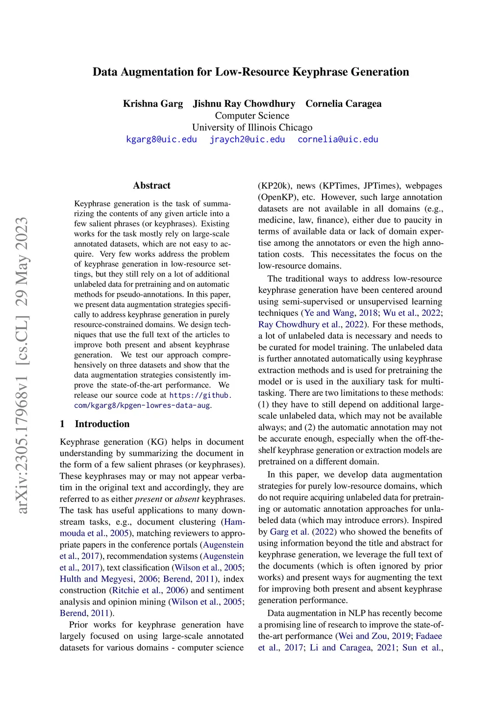 Keyphrase generation is the task of summarizing the contents of any given article into a few salient phrases (or keyphrases). Existing works for the task mostly rely on large-scale annotated datasets, which are not easy to acquire. Very few works address the problem of keyphrase generation in low-resource settings, but they still rely on a lot of additional unlabeled data for pretraining and on automatic methods for pseudo-annotations. In this paper, we present data augmentation strategies specifically to address keyphrase generation in purely resource-constrained domains. We design techniques that use the full text of the articles to improve both present and absent keyphrase generation. We test our approach comprehensively on three datasets and show that the data augmentation strategies consistently improve the state-of-the-art performance. We release our source code at https://github.com/kgarg8/kpgen-lowres-data-aug.