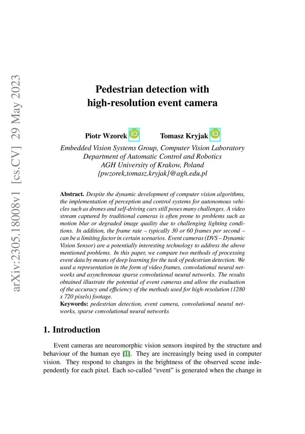Despite the dynamic development of computer vision algorithms, the implementation of perception and control systems for autonomous vehicles such as drones and self-driving cars still poses many challenges. A video stream captured by traditional cameras is often prone to problems such as motion blur or degraded image quality due to challenging lighting conditions. In addition, the frame rate - typically 30 or 60 frames per second - can be a limiting factor in certain scenarios. Event cameras (DVS -- Dynamic Vision Sensor) are a potentially interesting technology to address the above mentioned problems. In this paper, we compare two methods of processing event data by means of deep learning for the task of pedestrian detection. We used a representation in the form of video frames, convolutional neural networks and asynchronous sparse convolutional neural networks. The results obtained illustrate the potential of event cameras and allow the evaluation of the accuracy and efficiency of the methods used for high-resolution (1280 x 720 pixels) footage.