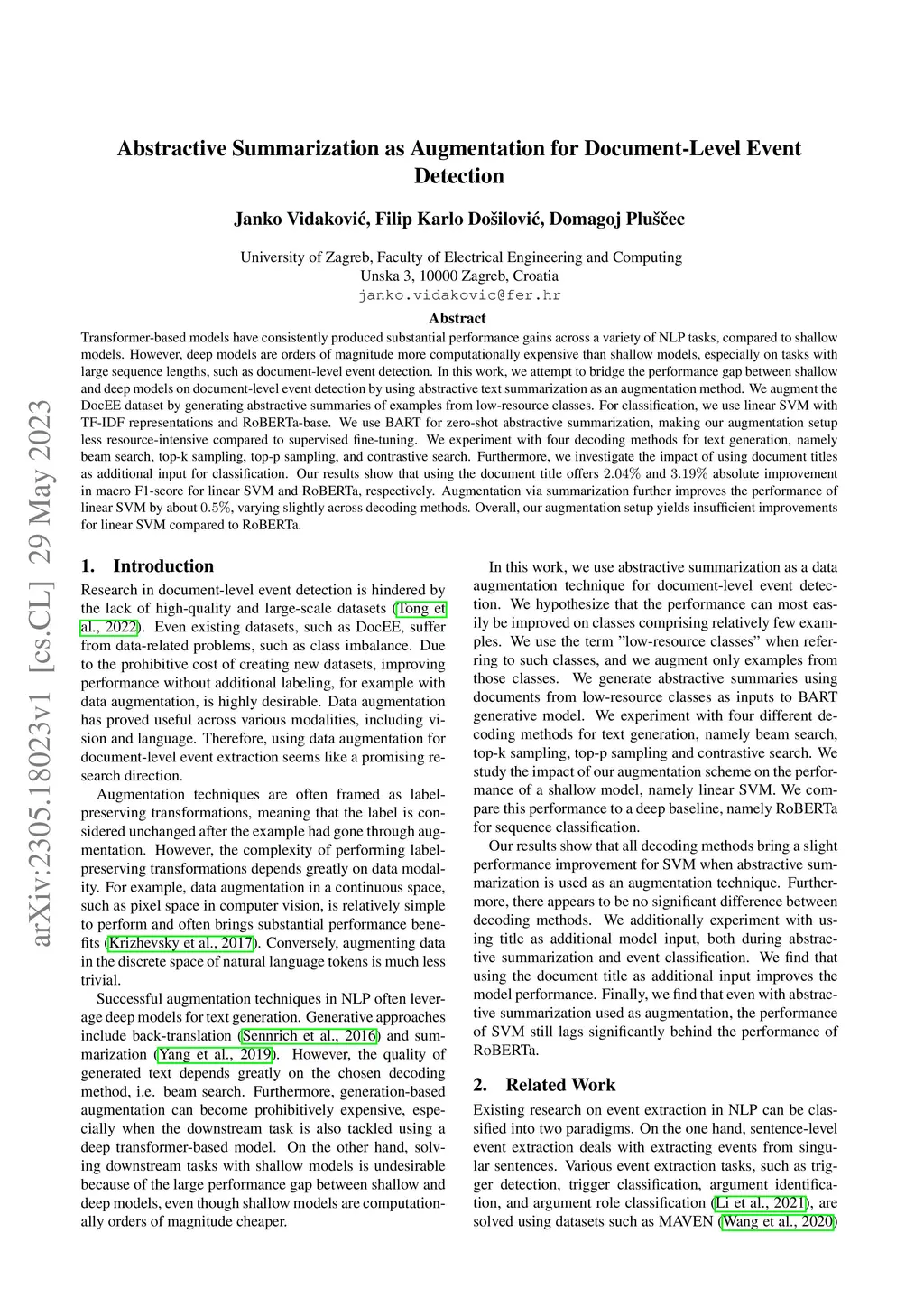Transformer-based models have consistently produced substantial performance gains across a variety of NLP tasks, compared to shallow models. However, deep models are orders of magnitude more computationally expensive than shallow models, especially on tasks with large sequence lengths, such as document-level event detection. In this work, we attempt to bridge the performance gap between shallow and deep models on document-level event detection by using abstractive text summarization as an augmentation method. We augment the DocEE dataset by generating abstractive summaries of examples from low-resource classes. For classification, we use linear SVM with TF-IDF representations and RoBERTa-base. We use BART for zero-shot abstractive summarization, making our augmentation setup less resource-intensive compared to supervised fine-tuning. We experiment with four decoding methods for text generation, namely beam search, top-k sampling, top-p sampling, and contrastive search. Furthermore, we investigate the impact of using document titles as additional input for classification. Our results show that using the document title offers 2.04% and 3.19% absolute improvement in macro F1-score for linear SVM and RoBERTa, respectively. Augmentation via summarization further improves the performance of linear SVM by about 0.5%, varying slightly across decoding methods. Overall, our augmentation setup yields insufficient improvements for linear SVM compared to RoBERTa.