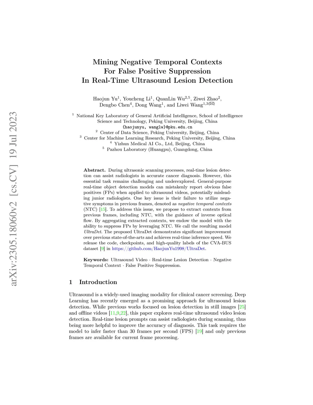 During ultrasonic scanning processes, real-time lesion detection can assist radiologists in accurate cancer diagnosis. However, this essential task remains challenging and underexplored. General-purpose real-time object detection models can mistakenly report obvious false positives (FPs) when applied to ultrasound videos, potentially misleading junior radiologists. One key issue is their failure to utilize negative symptoms in previous frames, denoted as negative temporal contexts (NTC). To address this issue, we propose to extract contexts from previous frames, including NTC, with the guidance of inverse optical flow. By aggregating extracted contexts, we endow the model with the ability to suppress FPs by leveraging NTC. We call the resulting model UltraDet. The proposed UltraDet demonstrates significant improvement over previous state-of-the-arts and achieves real-time inference speed. We release the code, checkpoints, and high-quality labels of the CVA-BUS dataset in https://github.com/HaojunYu1998/UltraDet.