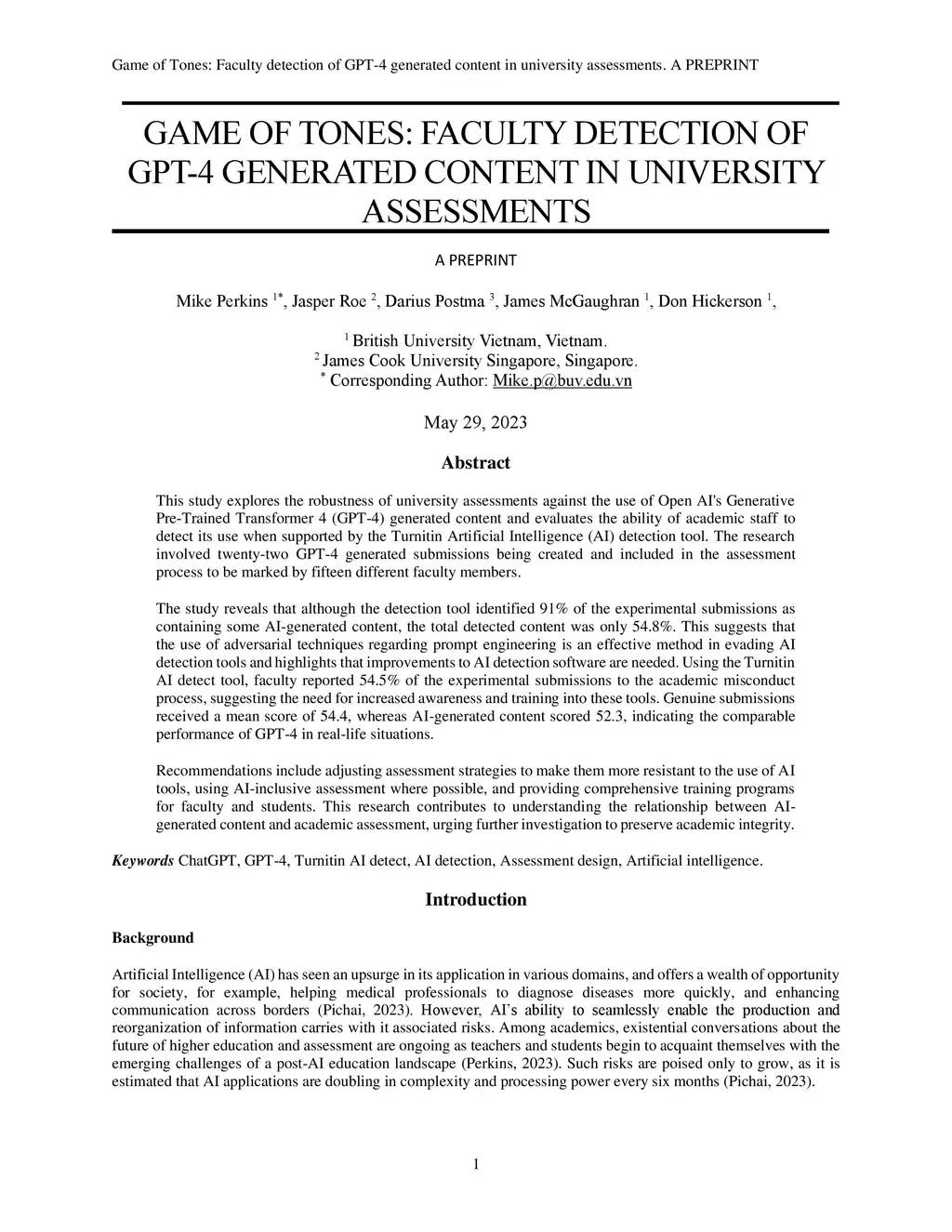 This study explores the robustness of university assessments against the use of Open AI's Generative Pre-Trained Transformer 4 (GPT-4) generated content and evaluates the ability of academic staff to detect its use when supported by the Turnitin Artificial Intelligence (AI) detection tool. The research involved twenty-two GPT-4 generated submissions being created and included in the assessment process to be marked by fifteen different faculty members. The study reveals that although the detection tool identified 91% of the experimental submissions as containing some AI-generated content, the total detected content was only 54.8%. This suggests that the use of adversarial techniques regarding prompt engineering is an effective method in evading AI detection tools and highlights that improvements to AI detection software are needed. Using the Turnitin AI detect tool, faculty reported 54.5% of the experimental submissions to the academic misconduct process, suggesting the need for increased awareness and training into these tools. Genuine submissions received a mean score of 54.4, whereas AI-generated content scored 52.3, indicating the comparable performance of GPT-4 in real-life situations. Recommendations include adjusting assessment strategies to make them more resistant to the use of AI tools, using AI-inclusive assessment where possible, and providing comprehensive training programs for faculty and students. This research contributes to understanding the relationship between AI-generated content and academic assessment, urging further investigation to preserve academic integrity.