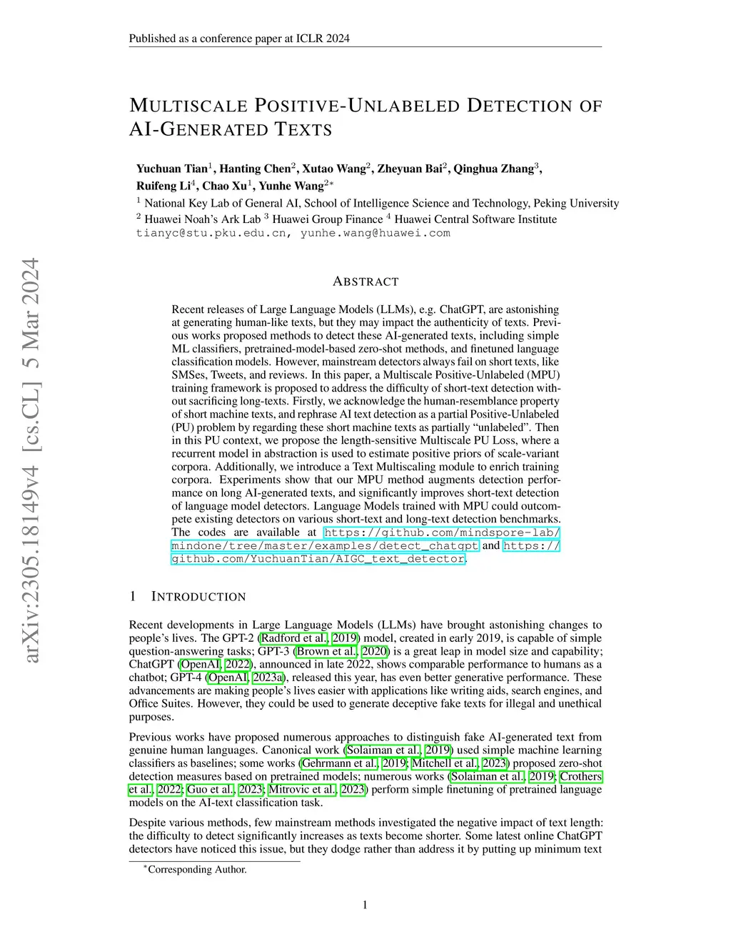 Recent releases of Large Language Models (LLMs), e.g. ChatGPT, are astonishing at generating human-like texts, but they may impact the authenticity of texts. Previous works proposed methods to detect these AI-generated texts, including simple ML classifiers, pretrained-model-based zero-shot methods, and finetuned language classification models. However, mainstream detectors always fail on short texts, like SMSes, Tweets, and reviews. In this paper, a Multiscale Positive-Unlabeled (MPU) training framework is proposed to address the difficulty of short-text detection without sacrificing long-texts. Firstly, we acknowledge the human-resemblance property of short machine texts, and rephrase AI text detection as a partial Positive-Unlabeled (PU) problem by regarding these short machine texts as partially ``unlabeled". Then in this PU context, we propose the length-sensitive Multiscale PU Loss, where a recurrent model in abstraction is used to estimate positive priors of scale-variant corpora. Additionally, we introduce a Text Multiscaling module to enrich training corpora. Experiments show that our MPU method augments detection performance on long AI-generated texts, and significantly improves short-text detection of language model detectors. Language Models trained with MPU could outcompete existing detectors on various short-text and long-text detection benchmarks. The codes are available at https://github.com/mindspore-lab/mindone/tree/master/examples/detect_chatgpt and https://github.com/YuchuanTian/AIGC_text_detector.