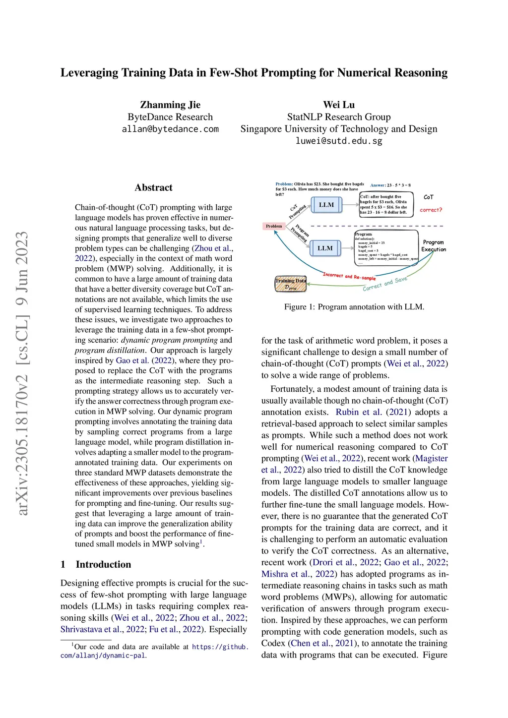 Chain-of-thought (CoT) prompting with large language models has proven effective in numerous natural language processing tasks, but designing prompts that generalize well to diverse problem types can be challenging, especially in the context of math word problem (MWP) solving. Additionally, it is common to have a large amount of training data that have a better diversity coverage but CoT annotations are not available, which limits the use of supervised learning techniques. To address these issues, we investigate two approaches to leverage the training data in a few-shot prompting scenario: dynamic program prompting and program distillation. Our approach is largely inspired by Gao et al., (2022), where they proposed to replace the CoT with the programs as the intermediate reasoning step. Such a prompting strategy allows us to accurately verify the answer correctness through program execution in MWP solving. Our dynamic program prompting involves annotating the training data by sampling correct programs from a large language model, while program distillation involves adapting a smaller model to the program-annotated training data. Our experiments on three standard MWP datasets demonstrate the effectiveness of these approaches, yielding significant improvements over previous baselines for prompting and fine-tuning. Our results suggest that leveraging a large amount of training data can improve the generalization ability of prompts and boost the performance of fine-tuned small models in MWP solving.