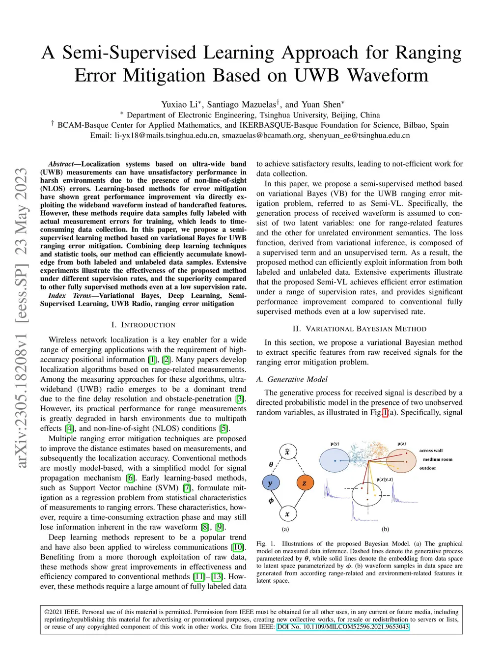 Localization systems based on ultra-wide band (UWB) measurements can have unsatisfactory performance in harsh environments due to the presence of non-line-of-sight (NLOS) errors. Learning-based methods for error mitigation have shown great performance improvement via directly exploiting the wideband waveform instead of handcrafted features. However, these methods require data samples fully labeled with actual measurement errors for training, which leads to time-consuming data collection. In this paper, we propose a semi-supervised learning method based on variational Bayes for UWB ranging error mitigation. Combining deep learning techniques and statistic tools, our method can efficiently accumulate knowledge from both labeled and unlabeled data samples. Extensive experiments illustrate the effectiveness of the proposed method under different supervision rates, and the superiority compared to other fully supervised methods even at a low supervision rate.