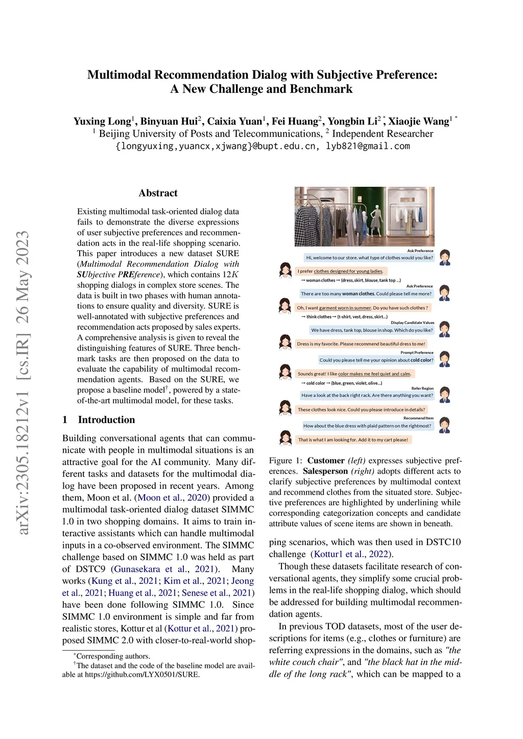 Existing multimodal task-oriented dialog data fails to demonstrate the diverse expressions of user subjective preferences and recommendation acts in the real-life shopping scenario. This paper introduces a new dataset SURE (Multimodal Recommendation Dialog with SUbjective PREference), which contains 12K shopping dialogs in complex store scenes. The data is built in two phases with human annotations to ensure quality and diversity. SURE is well-annotated with subjective preferences and recommendation acts proposed by sales experts. A comprehensive analysis is given to reveal the distinguishing features of SURE. Three benchmark tasks are then proposed on the data to evaluate the capability of multimodal recommendation agents. Based on the SURE, we propose a baseline model, powered by a state-of-the-art multimodal model, for these tasks.