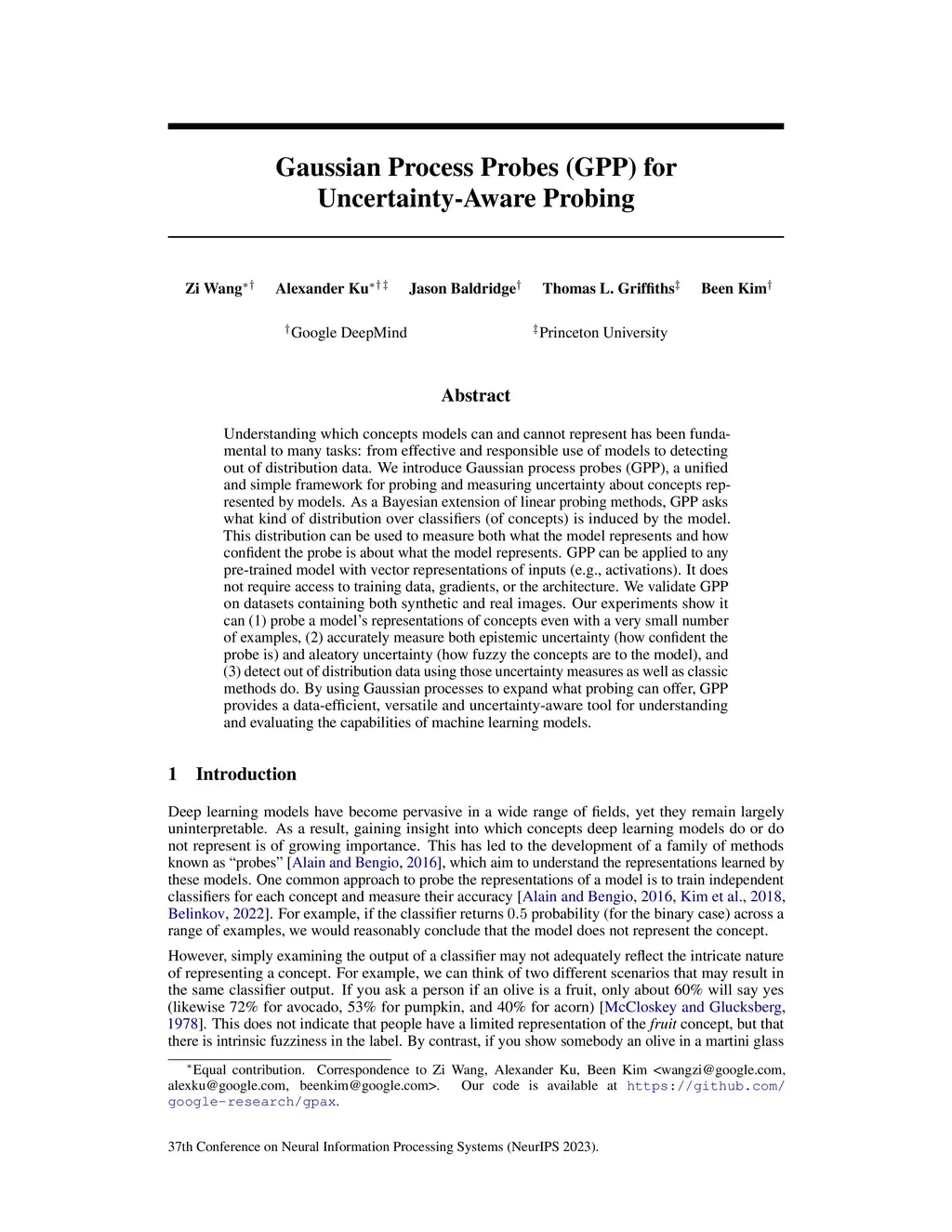 Understanding which concepts models can and cannot represent has been fundamental to many tasks: from effective and responsible use of models to detecting out of distribution data. We introduce Gaussian process probes (GPP), a unified and simple framework for probing and measuring uncertainty about concepts represented by models. As a Bayesian extension of linear probing methods, GPP asks what kind of distribution over classifiers (of concepts) is induced by the model. This distribution can be used to measure both what the model represents and how confident the probe is about what the model represents. GPP can be applied to any pre-trained model with vector representations of inputs (e.g., activations). It does not require access to training data, gradients, or the architecture. We validate GPP on datasets containing both synthetic and real images. Our experiments show it can (1) probe a model's representations of concepts even with a very small number of examples, (2) accurately measure both epistemic uncertainty (how confident the probe is) and aleatory uncertainty (how fuzzy the concepts are to the model), and (3) detect out of distribution data using those uncertainty measures as well as classic methods do. By using Gaussian processes to expand what probing can offer, GPP provides a data-efficient, versatile and uncertainty-aware tool for understanding and evaluating the capabilities of machine learning models.