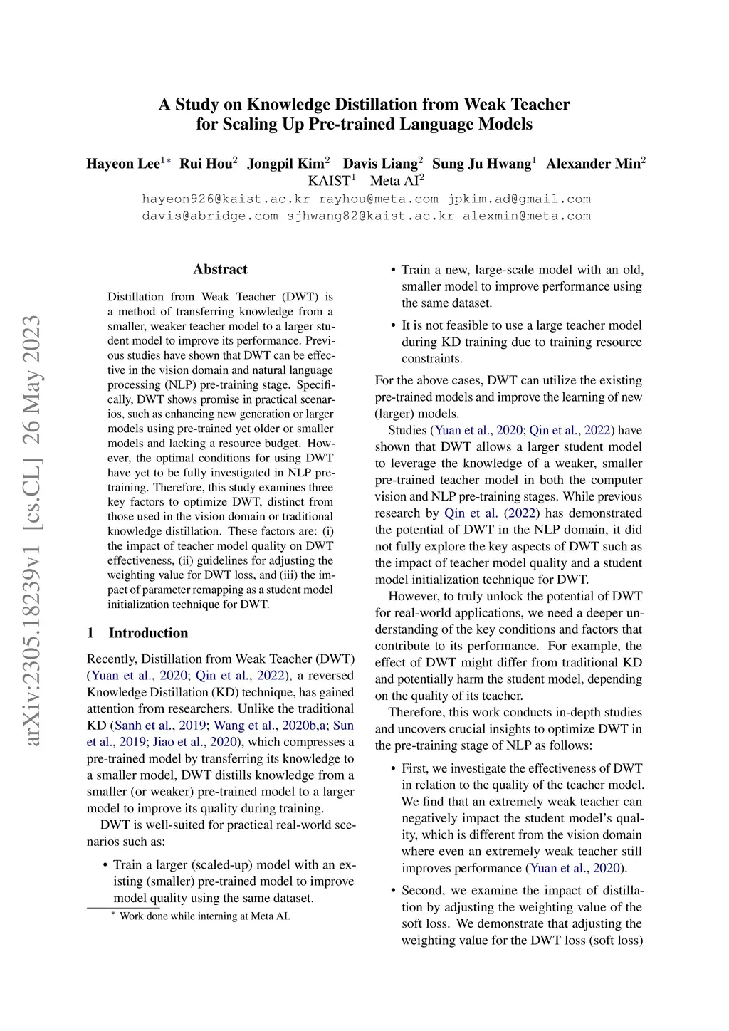 Distillation from Weak Teacher (DWT) is a method of transferring knowledge from a smaller, weaker teacher model to a larger student model to improve its performance. Previous studies have shown that DWT can be effective in the vision domain and natural language processing (NLP) pre-training stage. Specifically, DWT shows promise in practical scenarios, such as enhancing new generation or larger models using pre-trained yet older or smaller models and lacking a resource budget. However, the optimal conditions for using DWT have yet to be fully investigated in NLP pre-training. Therefore, this study examines three key factors to optimize DWT, distinct from those used in the vision domain or traditional knowledge distillation. These factors are: (i) the impact of teacher model quality on DWT effectiveness, (ii) guidelines for adjusting the weighting value for DWT loss, and (iii) the impact of parameter remapping as a student model initialization technique for DWT.