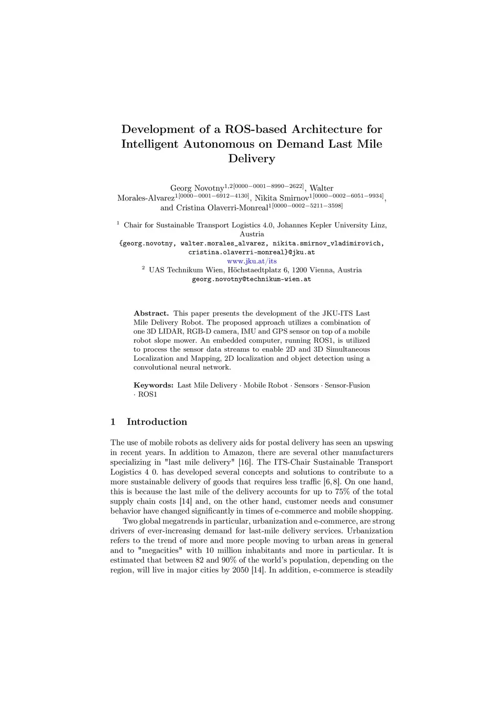 This paper presents the development of the JKU-ITS Last Mile Delivery Robot. The proposed approach utilizes a combination of one 3D LIDAR, RGB-D camera, IMU and GPS sensor on top of a mobile robot slope mower. An embedded computer, running ROS1, is utilized to process the sensor data streams to enable 2D and 3D Simultaneous Localization and Mapping, 2D localization and object detection using a convolutional neural network.
