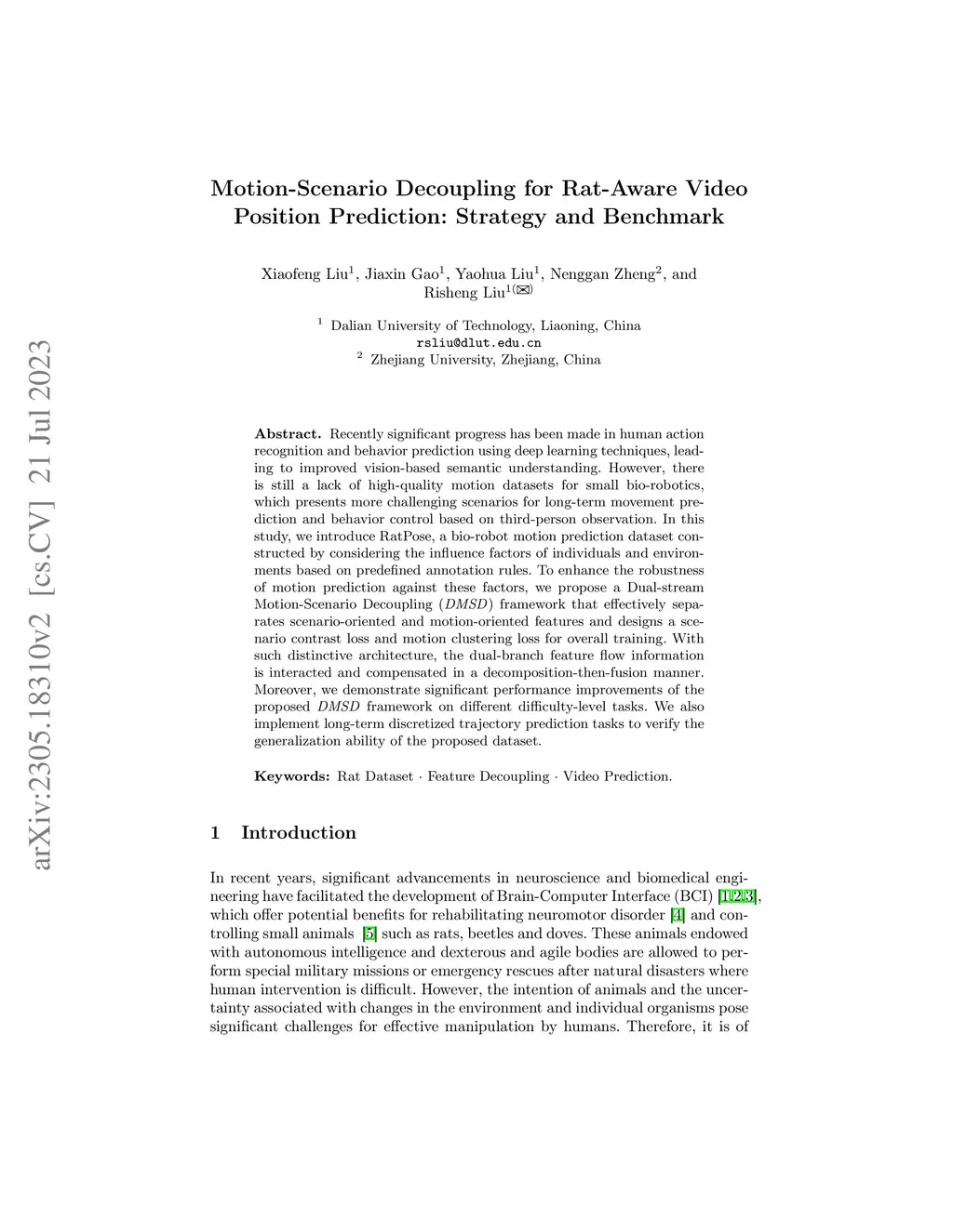 Recently significant progress has been made in human action recognition and behavior prediction using deep learning techniques, leading to improved vision-based semantic understanding. However, there is still a lack of high-quality motion datasets for small bio-robotics, which presents more challenging scenarios for long-term movement prediction and behavior control based on third-person observation. In this study, we introduce RatPose, a bio-robot motion prediction dataset constructed by considering the influence factors of individuals and environments based on predefined annotation rules. To enhance the robustness of motion prediction against these factors, we propose a Dual-stream Motion-Scenario Decoupling (\textit{DMSD}) framework that effectively separates scenario-oriented and motion-oriented features and designs a scenario contrast loss and motion clustering loss for overall training. With such distinctive architecture, the dual-branch feature flow information is interacted and compensated in a decomposition-then-fusion manner. Moreover, we demonstrate significant performance improvements of the proposed \textit{DMSD} framework on different difficulty-level tasks. We also implement long-term discretized trajectory prediction tasks to verify the generalization ability of the proposed dataset.