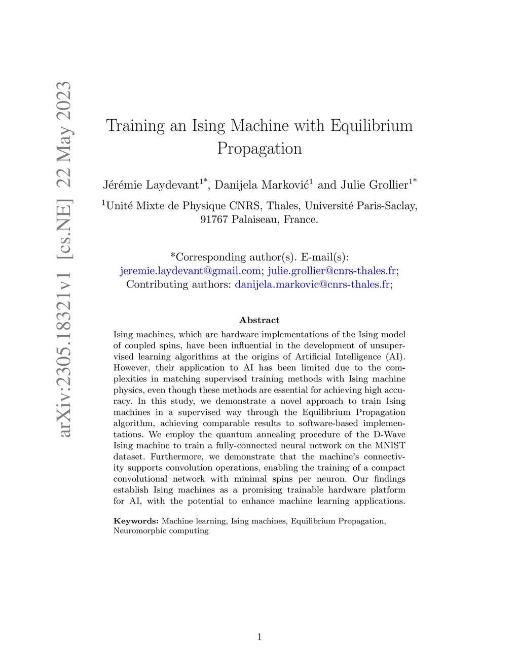 Ising machines, which are hardware implementations of the Ising model of coupled spins, have been influential in the development of unsupervised learning algorithms at the origins of Artificial Intelligence (AI). However, their application to AI has been limited due to the complexities in matching supervised training methods with Ising machine physics, even though these methods are essential for achieving high accuracy. In this study, we demonstrate a novel approach to train Ising machines in a supervised way through the Equilibrium Propagation algorithm, achieving comparable results to software-based implementations. We employ the quantum annealing procedure of the D-Wave Ising machine to train a fully-connected neural network on the MNIST dataset. Furthermore, we demonstrate that the machine's connectivity supports convolution operations, enabling the training of a compact convolutional network with minimal spins per neuron. Our findings establish Ising machines as a promising trainable hardware platform for AI, with the potential to enhance machine learning applications.