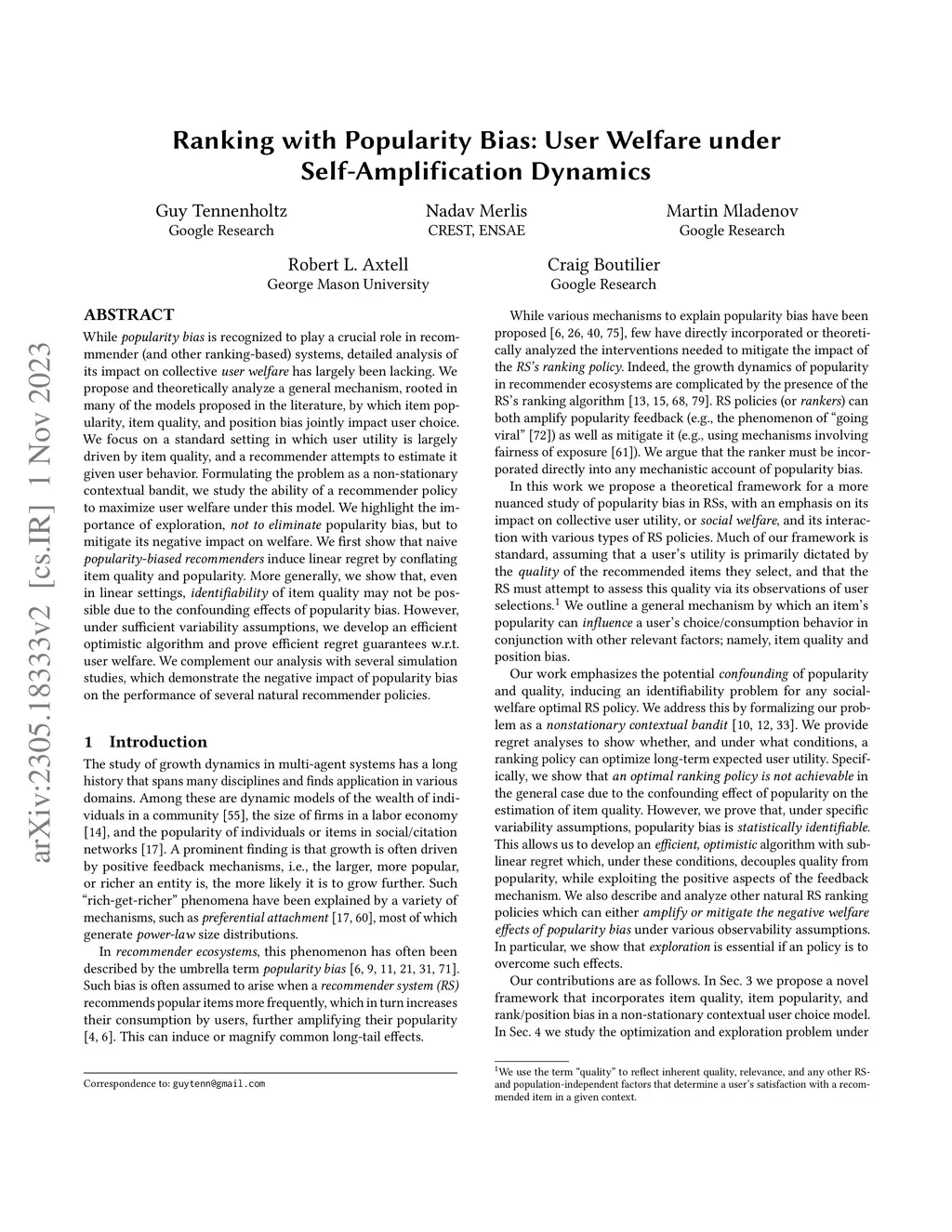 While popularity bias is recognized to play a crucial role in recommmender (and other ranking-based) systems, detailed analysis of its impact on collective user welfare has largely been lacking. We propose and theoretically analyze a general mechanism, rooted in many of the models proposed in the literature, by which item popularity, item quality, and position bias jointly impact user choice. We focus on a standard setting in which user utility is largely driven by item quality, and a recommender attempts to estimate it given user behavior. Formulating the problem as a non-stationary contextual bandit, we study the ability of a recommender policy to maximize user welfare under this model. We highlight the importance of exploration, not to eliminate popularity bias, but to mitigate its negative impact on welfare. We first show that naive popularity-biased recommenders induce linear regret by conflating item quality and popularity. More generally, we show that, even in linear settings, identifiability of item quality may not be possible due to the confounding effects of popularity bias. However, under sufficient variability assumptions, we develop an efficient optimistic algorithm and prove efficient regret guarantees w.r.t. user welfare. We complement our analysis with several simulation studies, which demonstrate the negative impact of popularity bias on the performance of several natural recommender policies.