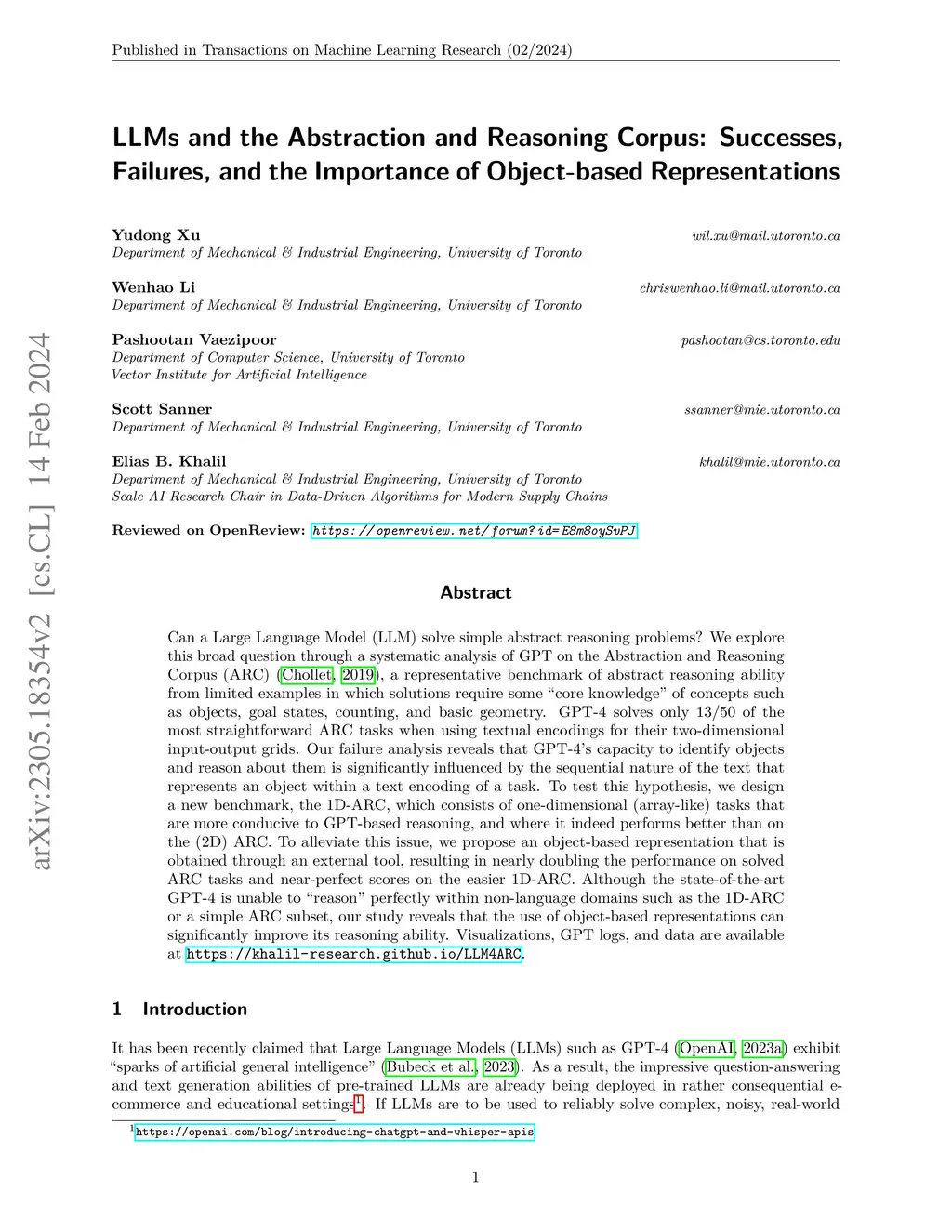 Can a Large Language Model (LLM) solve simple abstract reasoning problems? We explore this broad question through a systematic analysis of GPT on the Abstraction and Reasoning Corpus (ARC), a representative benchmark of abstract reasoning ability from limited examples in which solutions require some "core knowledge" of concepts such as objects, goal states, counting, and basic geometry. GPT-4 solves only 13/50 of the most straightforward ARC tasks when using textual encodings for their two-dimensional input-output grids. Our failure analysis reveals that GPT-4's capacity to identify objects and reason about them is significantly influenced by the sequential nature of the text that represents an object within a text encoding of a task. To test this hypothesis, we design a new benchmark, the 1D-ARC, which consists of one-dimensional (array-like) tasks that are more conducive to GPT-based reasoning, and where it indeed performs better than on the (2D) ARC. To alleviate this issue, we propose an object-based representation that is obtained through an external tool, resulting in nearly doubling the performance on solved ARC tasks and near-perfect scores on the easier 1D-ARC. Although the state-of-the-art GPT-4 is unable to "reason" perfectly within non-language domains such as the 1D-ARC or a simple ARC subset, our study reveals that the use of object-based representations can significantly improve its reasoning ability. Visualizations, GPT logs, and data are available at https://khalil-research.github.io/LLM4ARC.