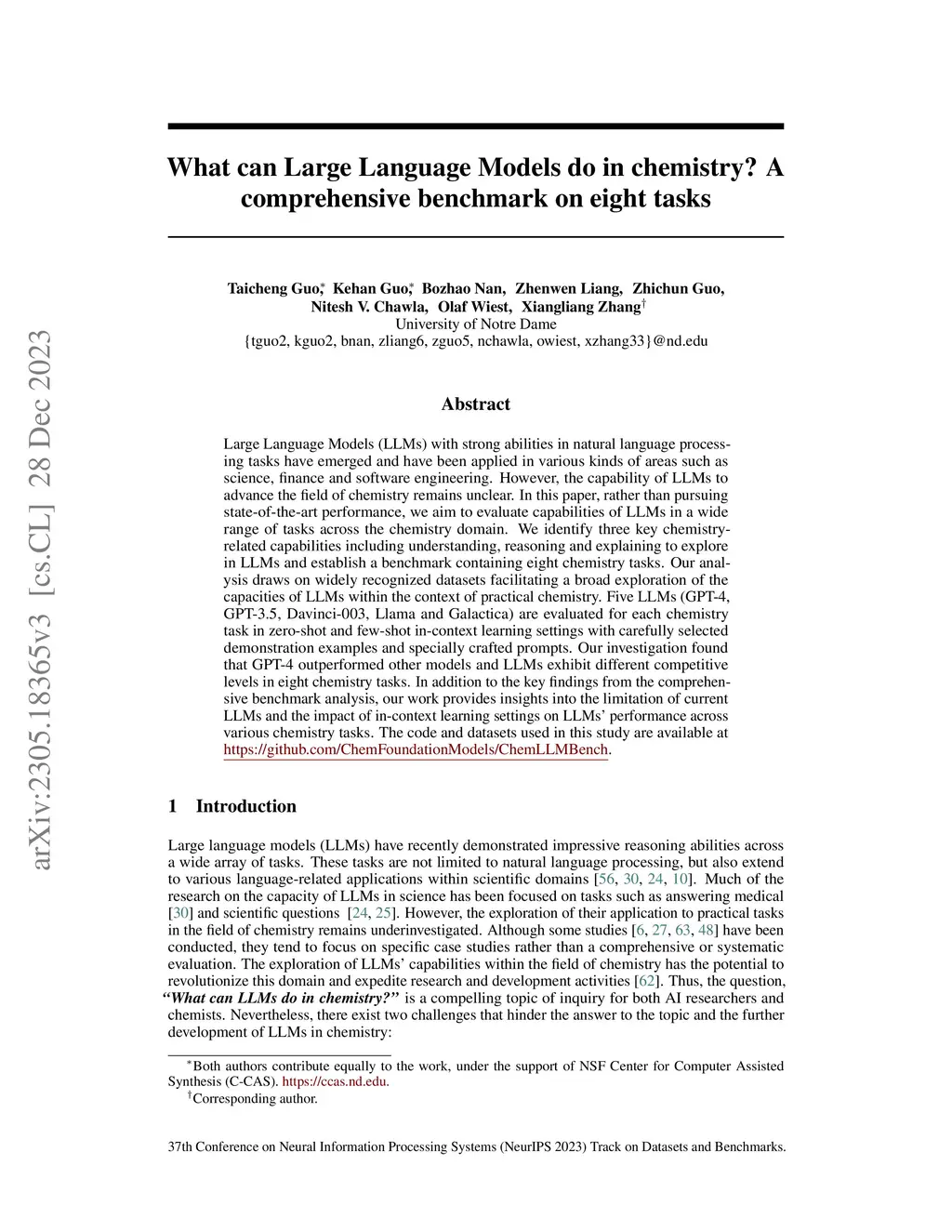 Large Language Models (LLMs) with strong abilities in natural language processing tasks have emerged and have been applied in various kinds of areas such as science, finance and software engineering. However, the capability of LLMs to advance the field of chemistry remains unclear. In this paper, rather than pursuing state-of-the-art performance, we aim to evaluate capabilities of LLMs in a wide range of tasks across the chemistry domain. We identify three key chemistry-related capabilities including understanding, reasoning and explaining to explore in LLMs and establish a benchmark containing eight chemistry tasks. Our analysis draws on widely recognized datasets facilitating a broad exploration of the capacities of LLMs within the context of practical chemistry. Five LLMs (GPT-4, GPT-3.5, Davinci-003, Llama and Galactica) are evaluated for each chemistry task in zero-shot and few-shot in-context learning settings with carefully selected demonstration examples and specially crafted prompts. Our investigation found that GPT-4 outperformed other models and LLMs exhibit different competitive levels in eight chemistry tasks. In addition to the key findings from the comprehensive benchmark analysis, our work provides insights into the limitation of current LLMs and the impact of in-context learning settings on LLMs' performance across various chemistry tasks. The code and datasets used in this study are available at https://github.com/ChemFoundationModels/ChemLLMBench.