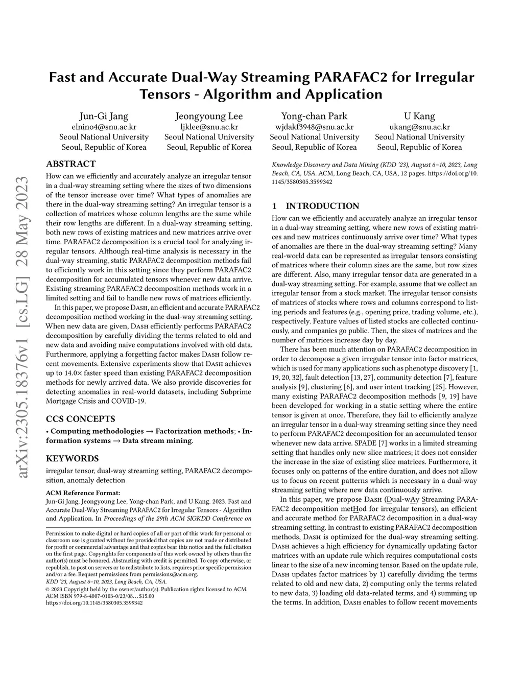 How can we efficiently and accurately analyze an irregular tensor in a dual-way streaming setting where the sizes of two dimensions of the tensor increase over time? What types of anomalies are there in the dual-way streaming setting? An irregular tensor is a collection of matrices whose column lengths are the same while their row lengths are different. In a dual-way streaming setting, both new rows of existing matrices and new matrices arrive over time. PARAFAC2 decomposition is a crucial tool for analyzing irregular tensors. Although real-time analysis is necessary in the dual-way streaming, static PARAFAC2 decomposition methods fail to efficiently work in this setting since they perform PARAFAC2 decomposition for accumulated tensors whenever new data arrive. Existing streaming PARAFAC2 decomposition methods work in a limited setting and fail to handle new rows of matrices efficiently. In this paper, we propose Dash, an efficient and accurate PARAFAC2 decomposition method working in the dual-way streaming setting. When new data are given, Dash efficiently performs PARAFAC2 decomposition by carefully dividing the terms related to old and new data and avoiding naive computations involved with old data. Furthermore, applying a forgetting factor makes Dash follow recent movements. Extensive experiments show that Dash achieves up to 14.0x faster speed than existing PARAFAC2 decomposition methods for newly arrived data. We also provide discoveries for detecting anomalies in real-world datasets, including Subprime Mortgage Crisis and COVID-19.