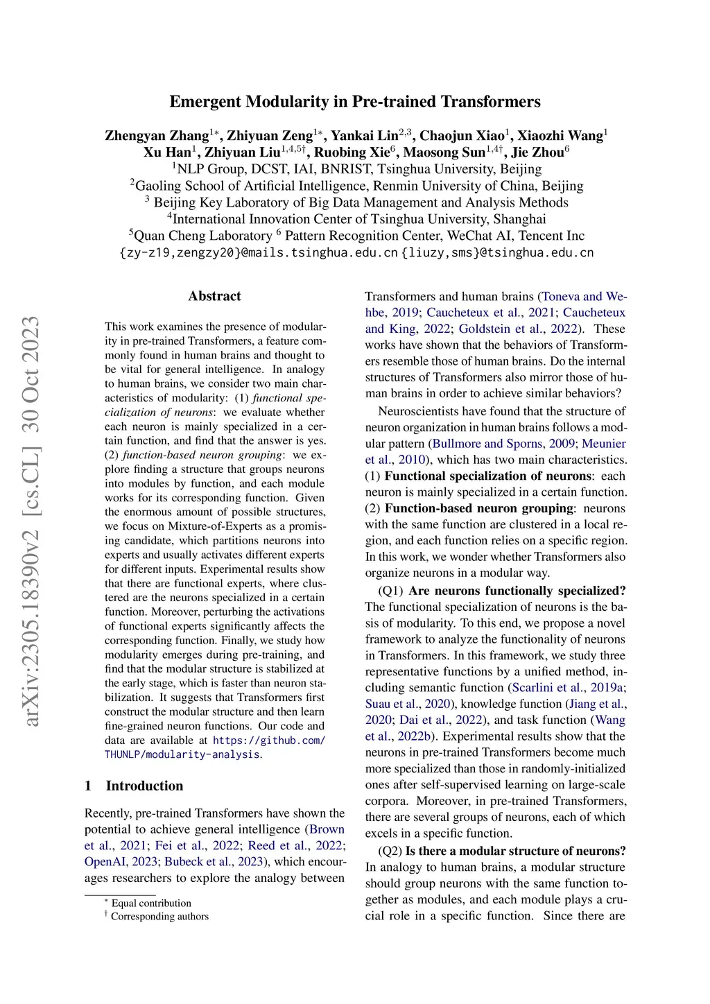 This work examines the presence of modularity in pre-trained Transformers, a feature commonly found in human brains and thought to be vital for general intelligence. In analogy to human brains, we consider two main characteristics of modularity: (1) functional specialization of neurons: we evaluate whether each neuron is mainly specialized in a certain function, and find that the answer is yes. (2) function-based neuron grouping: we explore finding a structure that groups neurons into modules by function, and each module works for its corresponding function. Given the enormous amount of possible structures, we focus on Mixture-of-Experts as a promising candidate, which partitions neurons into experts and usually activates different experts for different inputs. Experimental results show that there are functional experts, where clustered are the neurons specialized in a certain function. Moreover, perturbing the activations of functional experts significantly affects the corresponding function. Finally, we study how modularity emerges during pre-training, and find that the modular structure is stabilized at the early stage, which is faster than neuron stabilization. It suggests that Transformers first construct the modular structure and then learn fine-grained neuron functions. Our code and data are available at https://github.com/THUNLP/modularity-analysis.