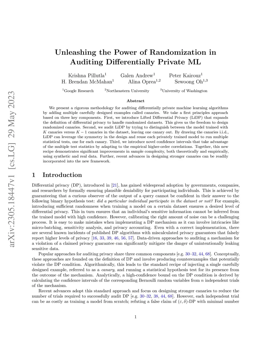 We present a rigorous methodology for auditing differentially private machine learning algorithms by adding multiple carefully designed examples called canaries. We take a first principles approach based on three key components. First, we introduce Lifted Differential Privacy (LiDP) that expands the definition of differential privacy to handle randomized datasets. This gives us the freedom to design randomized canaries. Second, we audit LiDP by trying to distinguish between the model trained with canaries versus canaries in the dataset, leaving one canary out. By drawing the canaries i.i.d., LiDP can leverage the symmetry in the design and reuse each privately trained model to run multiple statistical tests, one for each canary. Third, we introduce novel confidence intervals that take advantage of the multiple test statistics by adapting to the empirical higher-order correlations. Together, this new recipe demonstrates significant improvements in sample complexity, both theoretically and empirically, using synthetic and real data. Further, recent advances in designing stronger canaries can be readily incorporated into the new framework.
