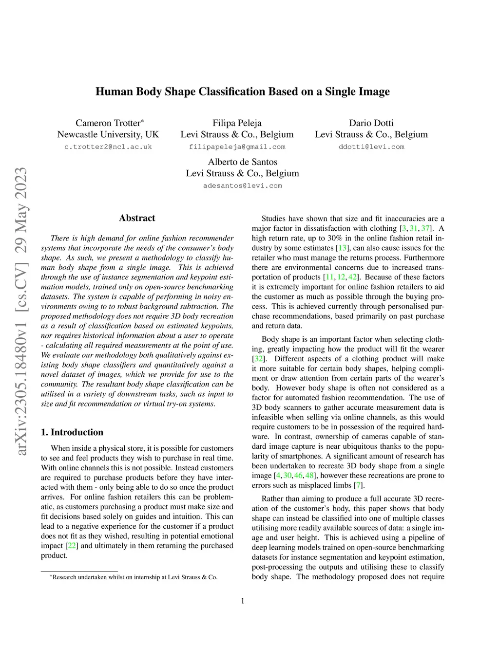 There is high demand for online fashion recommender systems that incorporate the needs of the consumer's body shape. As such, we present a methodology to classify human body shape from a single image. This is achieved through the use of instance segmentation and keypoint estimation models, trained only on open-source benchmarking datasets. The system is capable of performing in noisy environments owing to to robust background subtraction. The proposed methodology does not require 3D body recreation as a result of classification based on estimated keypoints, nor requires historical information about a user to operate - calculating all required measurements at the point of use. We evaluate our methodology both qualitatively against existing body shape classifiers and quantitatively against a novel dataset of images, which we provide for use to the community. The resultant body shape classification can be utilised in a variety of downstream tasks, such as input to size and fit recommendation or virtual try-on systems.