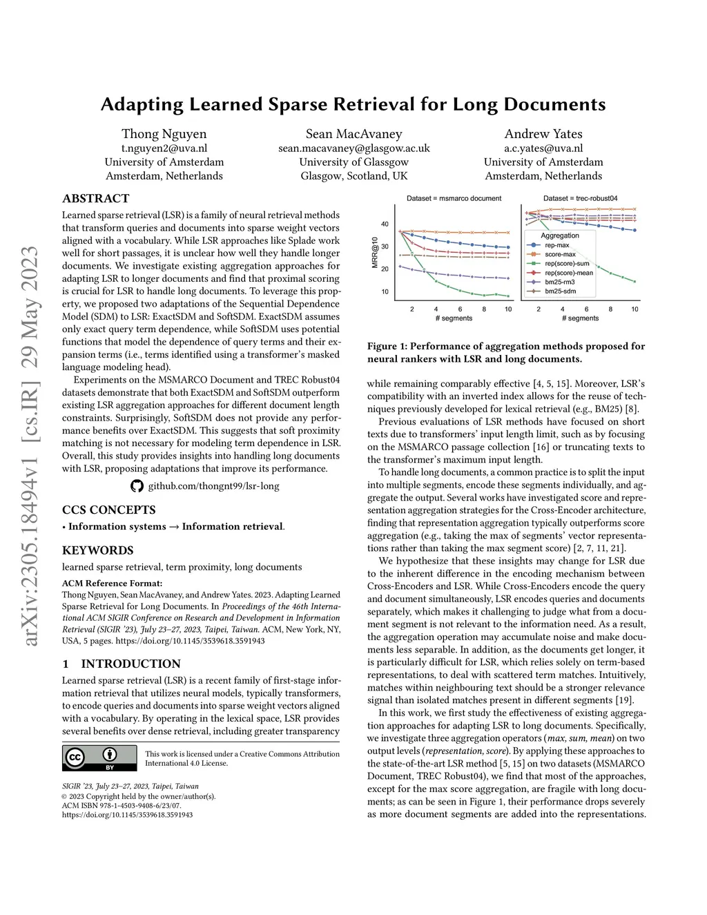 Learned sparse retrieval (LSR) is a family of neural retrieval methods that transform queries and documents into sparse weight vectors aligned with a vocabulary. While LSR approaches like Splade work well for short passages, it is unclear how well they handle longer documents. We investigate existing aggregation approaches for adapting LSR to longer documents and find that proximal scoring is crucial for LSR to handle long documents. To leverage this property, we proposed two adaptations of the Sequential Dependence Model (SDM) to LSR: ExactSDM and SoftSDM. ExactSDM assumes only exact query term dependence, while SoftSDM uses potential functions that model the dependence of query terms and their expansion terms (i.e., terms identified using a transformer's masked language modeling head). Experiments on the MSMARCO Document and TREC Robust04 datasets demonstrate that both ExactSDM and SoftSDM outperform existing LSR aggregation approaches for different document length constraints. Surprisingly, SoftSDM does not provide any performance benefits over ExactSDM. This suggests that soft proximity matching is not necessary for modeling term dependence in LSR. Overall, this study provides insights into handling long documents with LSR, proposing adaptations that improve its performance.